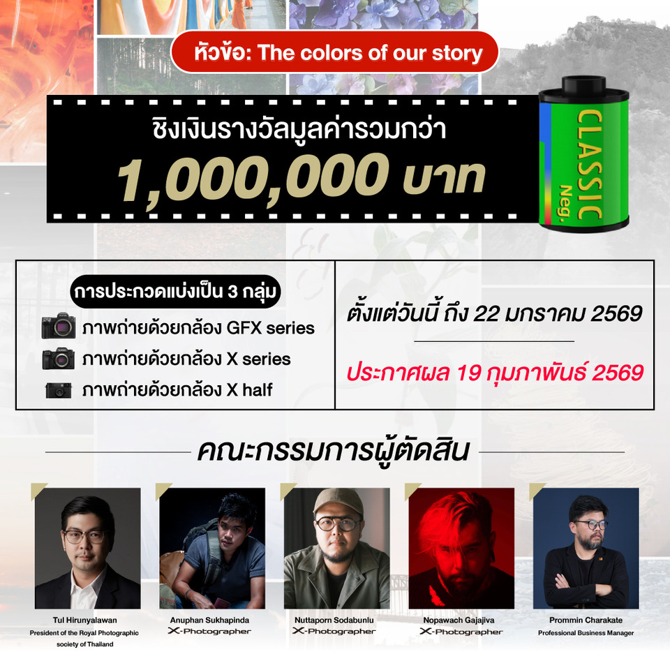 ฟูจิฟิล์ม เปิดแคมเปญยิ่งใหญ่แห่งปีของวงการภาพถ่าย Fujifilm Photo Contest 2025 ในหัวข้อ “The Colors of Our Story” ชวนช่างภาพโชว์ไอเดีย “สีสันแห่งเรื่องราว” ชิงรางวัลรวมกว่า 1 ล้านบาท ส่งภาพเข้าประกวดได้ตั้งแต่วันนี้ - 22 มกราคม 2569