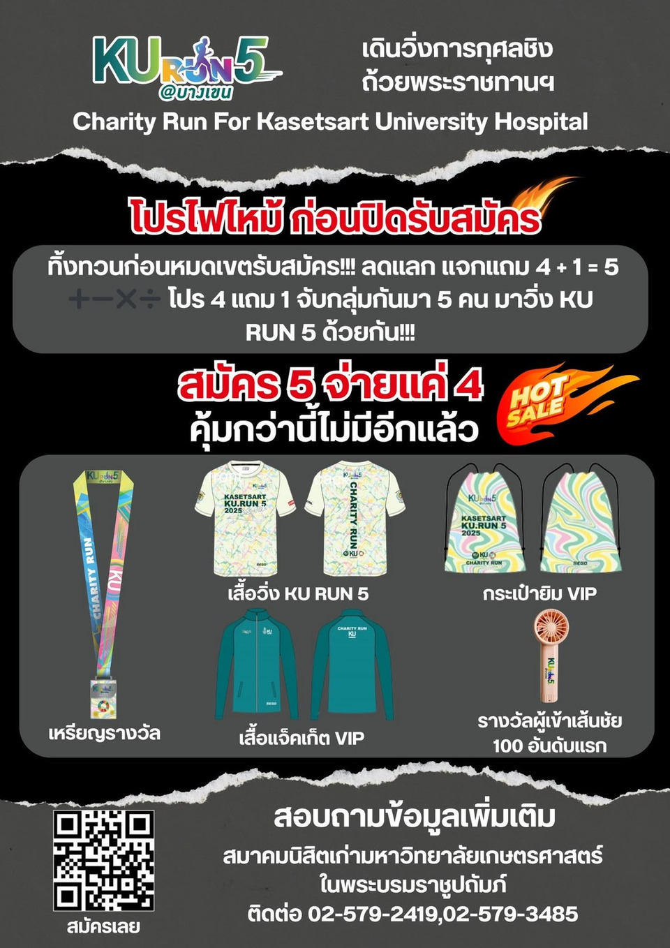 ขอเชิญชวนกลุ่มเพื่อน กลุ่มคณะ กลุ่มมหาวิทยาลัย กลุ่มโรงเรียน กลุ่มครอบครัว กลุ่มนักวิ่ง กลุ่มรักษ์สุขภาพ กลุ่มใจบุญ หรือว่า กลุ่มไหนๆ ก็สมัครกับ KU RUN 5 ได้ กับ ระยะวิ่ง 2.5 กม. 5 กม. 10 กม. และ VIP สุดคุ้มสมัคร 5 จ่ายแค่ 4 เท่านั้น !!! เปิดระบบสมัครวันที่ 18 - 21 พ.ย. 68 รับเสื้อวิ่งรักษ์โลกผลิตจากขวดพลาสติก เหรียญรางวัล ของรางวัลสุดน่ารัก เสื้อแจ็คเก็ต VIP กระเป๋ายิม VIP
