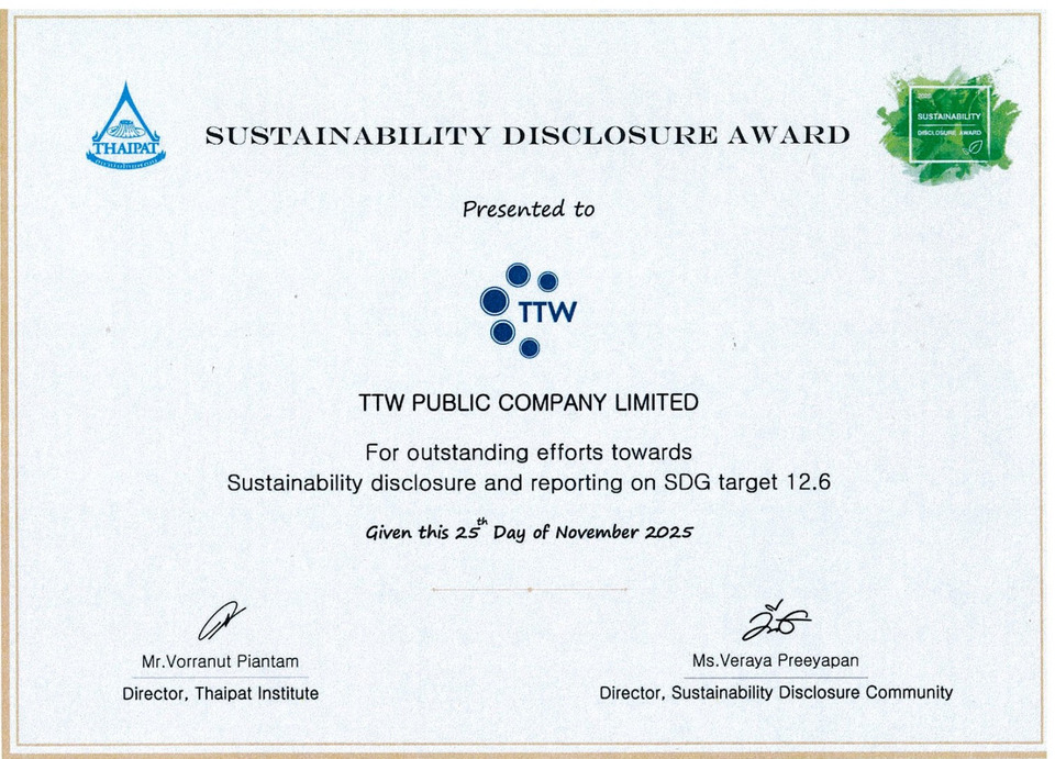 บริษัท ทีทีดับบลิว จำกัด (มหำชน) หรือ TTW ได้รับรางวัลเกียรติคุณ “Sustainability Disclosure Award” ประจำปี 2568 ต่อเนื่องเป็นปีที่ 7 จากสถาบันไทยพัฒน์ ในฐานะองค์กรที่มีการเปิดเผยข้อมูลด้านความยั่งยืนที่เป็นประโยชน์ต่อกลุ่มผู้มีส่วนได้ส่วนเสีย โดยรางวัลนี้พิจารณาจากการประเมินข้อมูลการดำเนินงานที่องค์กรเผยแพร่ต่อ