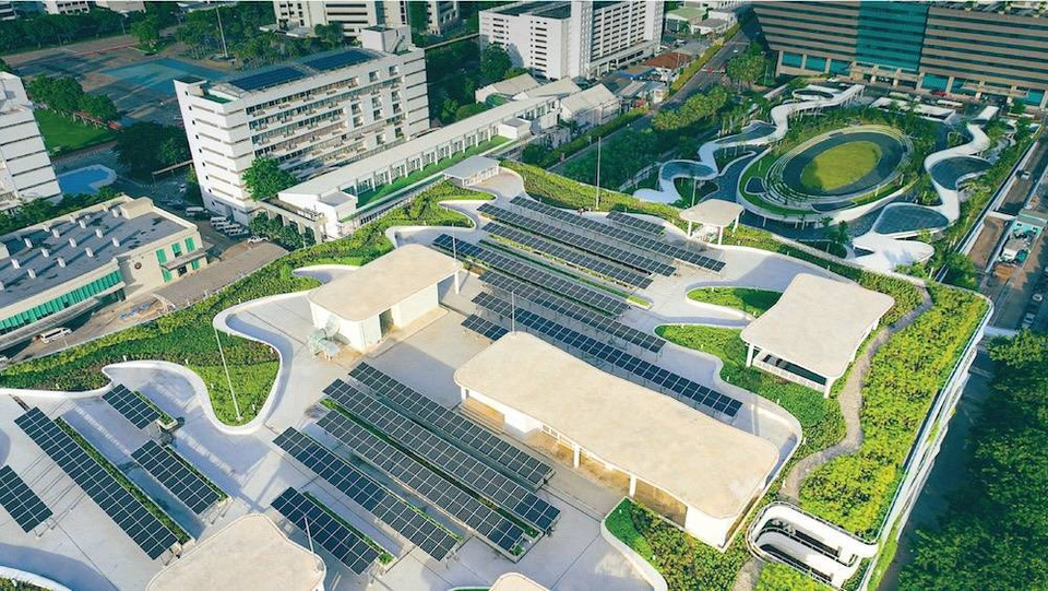 พื้นที่กว่า 138 ไร่รวมโครงข่ายถนนถูกออกแบบเป็น Cooling Biodiversity Pathways ปลูกไม้พื้นถิ่นกว่า 5,500 ต้น ใช้ระบบร่องน้ำธรรมชาติ (Bioswale) และสวนน้ำฝน (Rain Garden) เพื่อจัดการน้ำและลดมลพิษในอากาศ พื้นที่นี้ยังเป็นแหล่งอาศัยของนก ผีเสื้อ และแมลงผสมเกสร แนวทางดังกล่าวสอดคล้องกับรายงานของ World Economic Forum เรื่อง Nature positive city (2024) ที่ชี้ว่าการฟื้นฟูระบบนิเวศเมืองช่วยลดอุณหภูมิได้