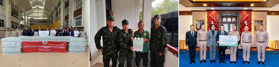 โดยได้นำน้ำดื่มขนส่งจากกองบัญชาการฐานทัพเรือสัตหีบไปยังพื้นที่หาดใหญ่จังหวัดสงขลา และอีกหลายจังหวัดชายแดนภาคใต้ ซึ่งตอนนี้เรือหลวงจักรีนฤเบศรได้เดินทางไปถึงจังหวัดสงขลา และได้นำน้ำดื่ม และเครื่องอุปโภคบริโภคของทั้งไทยเบฟ และคณะนักศึกษา วปอ. 66 นำไปส่งต่อให้ผู้ประสบภัยผ่านทหารเรือเรียบร้อยแล้ว รวมถึงได้จัดส่งไปที่ศาลากลางจังหวัดสงขลา เพื่อส่งต่อไปยังค่ายเสนาณรงค์ (มทบ. 42) ซึ่งเป็นกองบัญชาการช่วยเหลือผู้ประสบภัยของจังหวัดสงขลา และได้ส่งมอบให้หน่วยงานอาสา และมูลนิธิต่าง ๆ ที่เข้ามาช่วยเหลือค้นหาผู้ประสบภัยให้สามารถที่จะนำน้ำดื่มเข้าถึงผู้ประสบภัยได้อย่างรวดเร็ว นอกจากนี้ ไทยเบฟยังขนส่งนำดื่มผ่านไทยเบฟโลจิสติกส์ไปยังอีกหลายพื้นที่จังหวัดชายแดนภาคใต้ โดยได้ผสานความร่วมมือกับศูนย์อำนวยการบริหารจังหวัดชายแดนภาคใต้ (ศอ.บต.) ให้ช่วยกระจายต่อไปยังพี่น้องประชาชนอย่างรวดเร็วที่สุด”