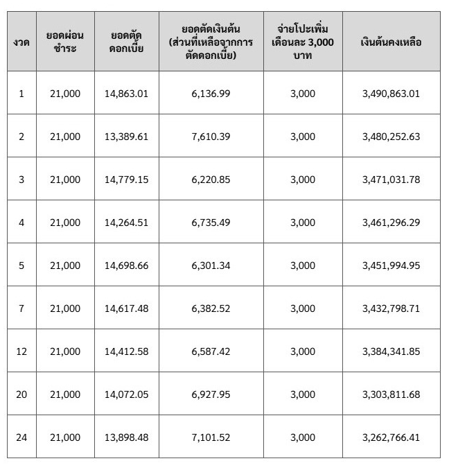 ตัวอย่างตารางการผ่อนบ้านแบบชำระเกินทุกงวด โปะเดือนละ 3,000 บาท (สมมติวงเงินกู้ 3.5 ล้านบาท ดอกเบี้ย 5% ต่อปี ระยะเวลา 24 เดือน)