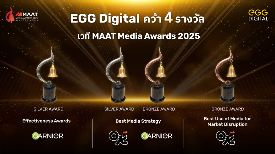 เอ้ก ดิจิทัล (EGG Digital) ตอกย้ำศักยภาพในฐานะผู้ให้บริการสื่อโฆษณาครบวงจรแห่งยุคดิจิทัล คว้า 4 รางวัลจากเวทีสื่อโฆษณาระดับประเทศ “MAAT Media Awards 2025” ได้แก่ รางวัลระดับ Silver 2 รางวัล และ Bronze 2 รางวัล จากแคมเปญ MAMA OK และ Garnier (การ์นิเย่) โชว์ความสามารถในการวางกลยุทธ์การสื่อสารและโฆษณาที่ทรงพลัง ผ่านการผสาน “ดาต้า 720 องศา – AI – ครีเอทีฟ – รีเทลมีเดียเน็ตเวิร์ก” ในรูปแบบ Omnichannel เชื่อมโยงสื่อทุกช่องทางอย่างไร้รอยต่อ สร้างการสื่อสารที่แม่นยำ เข้าถึงผู้บริโภคในทุกทัชพอยท์ พร้อมสร้างโอกาสใหม่และผลลัพธ์ทางธุรกิจที่วัดผลได้ให้กับแบรนด์