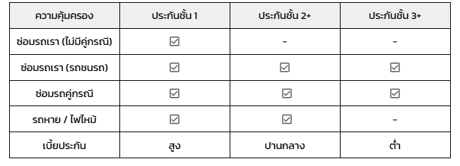 ตารางเปรียบเทียบประกันชั้น 1 vs 2+ vs 3+ สำหรับรถอายุเกิน 7 ปี