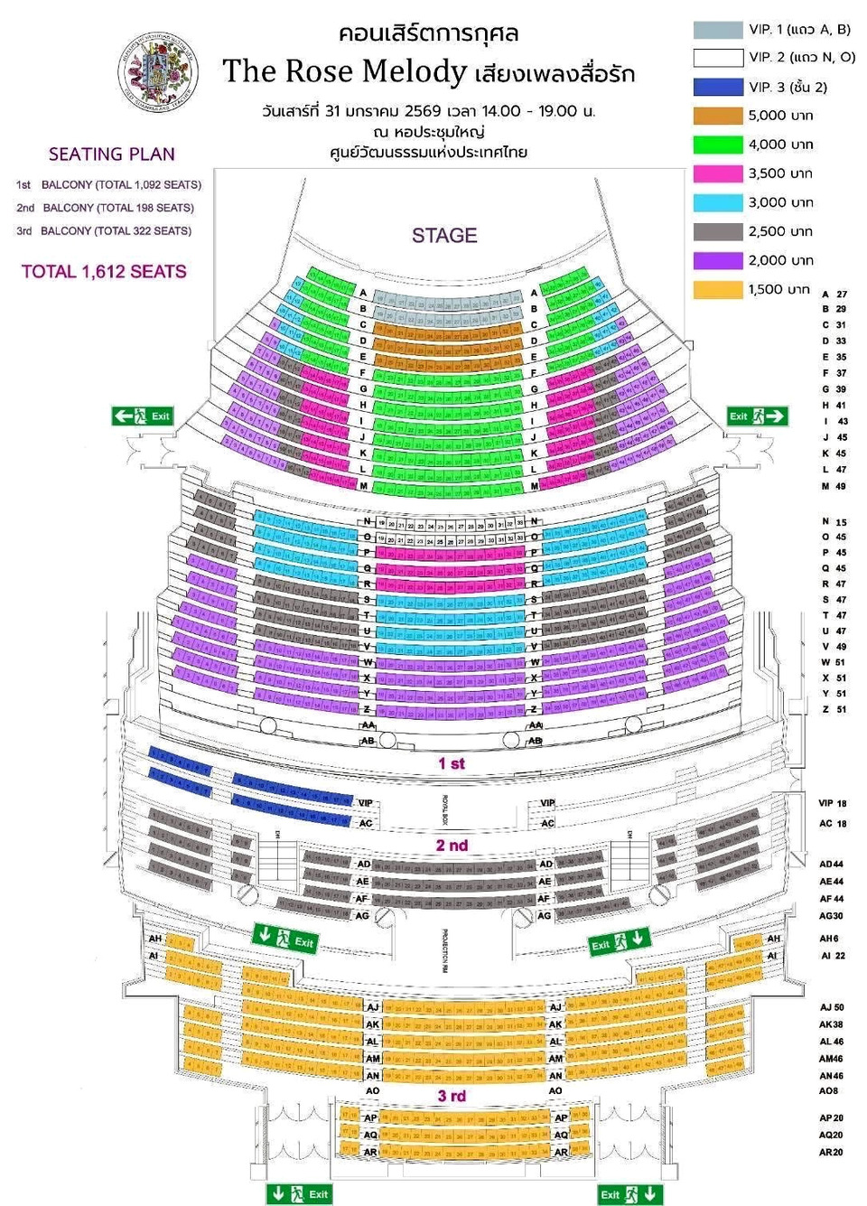 คอนเสิร์ตการกุศล “The Rose Melody เสียงเพลงสื่อรัก” จัดขึ้นในวันเสาร์ที่ 31 มกราคม 2569 เวลา 14.00-19.00 น. ณ หอประชุมใหญ่ ศูนย์วัฒนธรรม กับราคาบัตรที่จับต้องได้ เริ่มที่ 1,500 / 2,000 / 2,500 / 3,000 / 3,500 / 4,000 และ 5,000 บาท ล็อคเป้าจองบัตรได้เลยทาง https://lin.ee/qyU3cP5 #TheRoseMelodyเสียงเพลงสื่อรัก