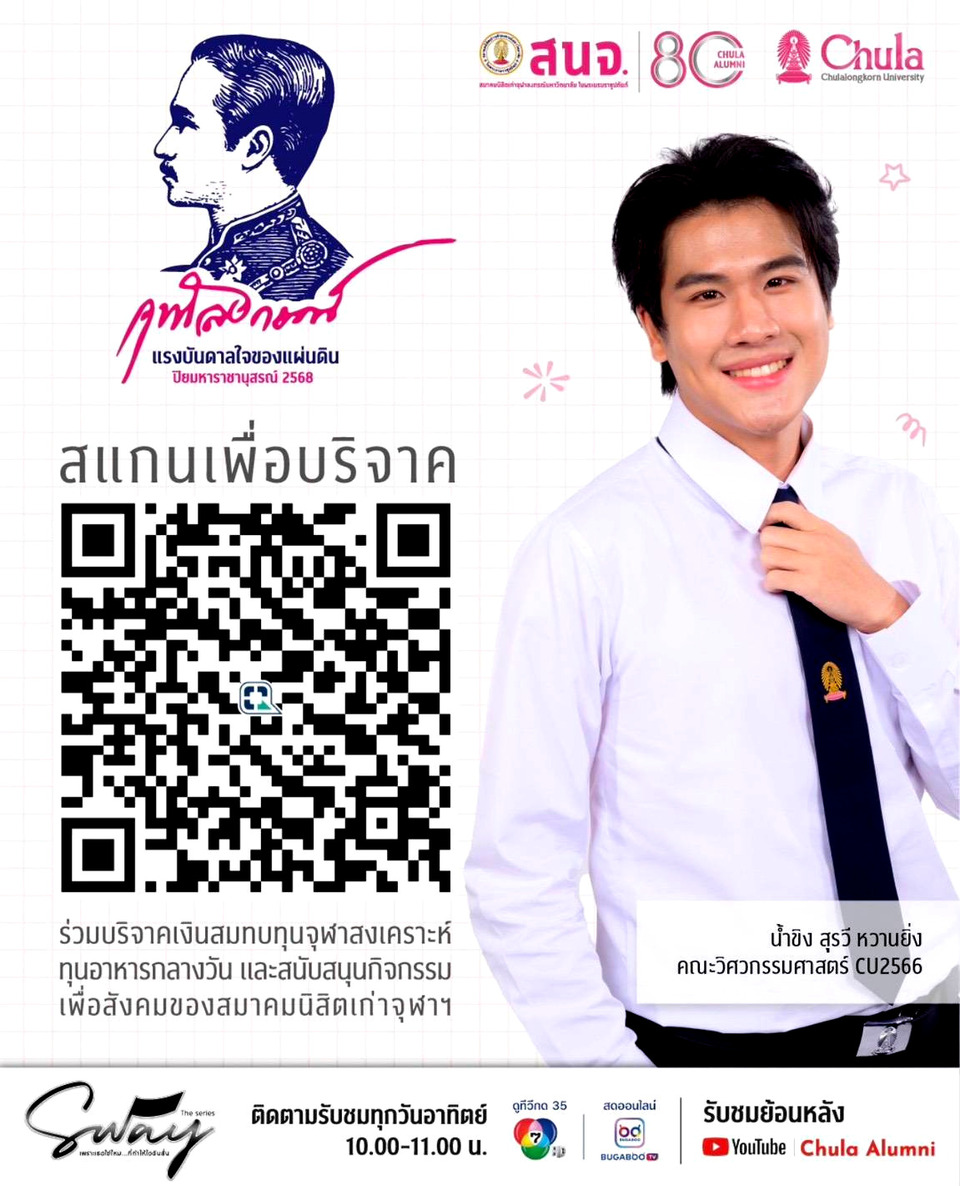 ติดตามรับชมซีรีส์ “Sway The Series เพราะเธอใช่ไหม...ที่ทำให้ใจฉันสั่น” ตอนจบ อาทิตย์ 14 ธ.ค.นี้ เวลา 10.00 น. ทาง #ช่อง7HD #กด35 รับชมย้อนหลัง Youtube Chula Alumni และอย่าลืมสแกน QR Code บริจาคเงิน E-Donation สมทบทุนจุฬาสงเคราะห์ ทุนอาหารกลางวัน และสนับสนุนกิจกรรมเพื่อสังคมของ สนจ. กันด้วยน้า