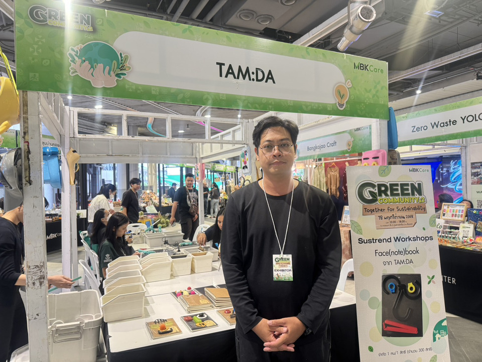 เวิร์กช้อปด้านความยั่งยืนในงาน Green Community# 2 Together for Sustainability ในโซน Sustrend Workshops ที่ทางบริษัท เอ็ม บี เค จำกัด (มหาชน) ได้รวมพลังพันธมิตรธุรกิจสายกรีน ทั้งภาครัฐและภาคเอกชน จัดงานนี้ไป เมื่อปลายเดือนที่ผ่านมา ที่ทางเอ็ม บี เค ได้เชิญทาง TAM:DA สตูดิโอ ของ เป๋-ธนวัต มณีนาวา นักออกแบบผลิตภัณฑ์ และเจ้าของเพจ TAM:DA “ทำดะ” ซึ่งแปลตามตัวตรง ๆ ว่า เจออะไรทำหมด หรืออาจจะอ่านอีกอย่างได้ว่า ทำ – มะ – ดา ซึ่งคือการนำวัสดุสิ่งของธรรมดาใกล้ ๆ ที่ไม่ใช้แล้ว มาทำใหม่ให้เกิดประโยชน์