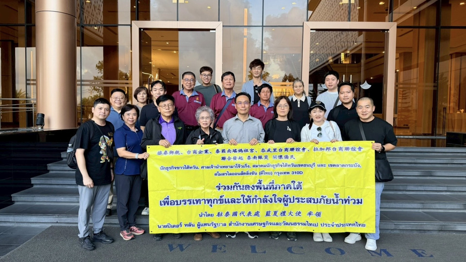 ภาคใต้สถานการณ์ที่ประเทศไทยประสบมหาอุทกภัยครั้งร้ายแรงที่สุดในรอบหลายปีที่ผ่านมา มีผู้เสียชีวิตมากกว่า 140 ราย และทรัพย์สินเสียหายมากกว่าหมื่นล้านบาท แม้ว่าคนไต้หวันและนักธุรกิจชาวไต้หวันที่อาศัยอยู่ในพื้นที่ดังกล่าวจะปลอดภัย แต่บ้านเรือน ร้านค้า และโรงงานของหลายคนได้รับความเสียหายอย่างหนักจากเหตุอุทกภัยดังกล่าว