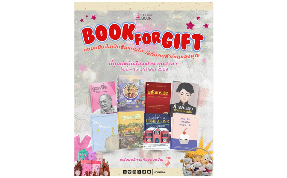 ศูนย์หนังสือจุฬาฯ ขอเชิญชวนมอบหนังสือเป็นของขวัญ เพื่อส่งความสุขแด่คนสำคัญ ในวาระดิถี ขึ้นปีใหม่ กับเทศกาล... “มอบหนังสือเป็นสื่อแทนใจ” ตั้งแต่วันนี้ ถึง 15 มกราคม 2569 ที่ศูนย์หนังสือจุฬาฯ ทุกสาขา และทุกแพลตฟอร์มของศูนย์หนังสือจุฬาฯ