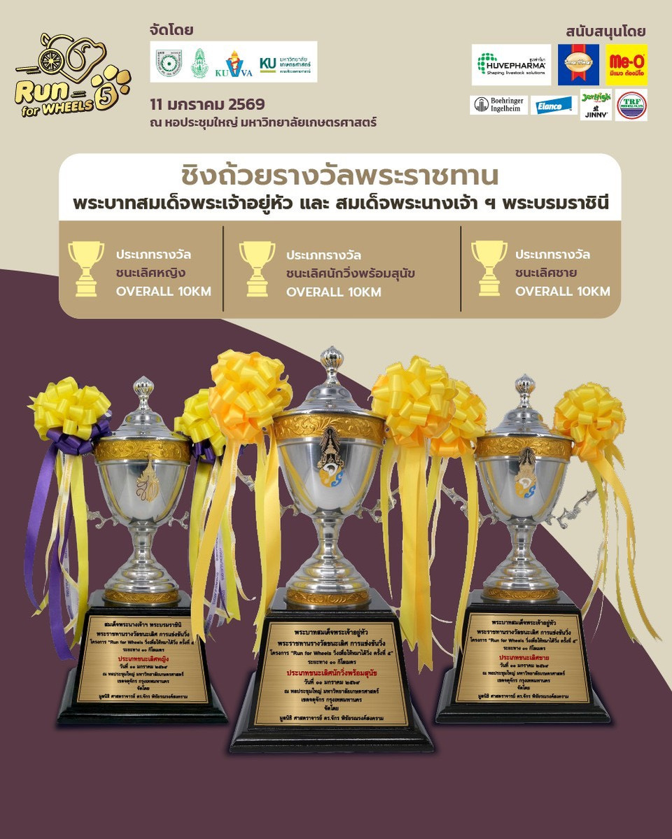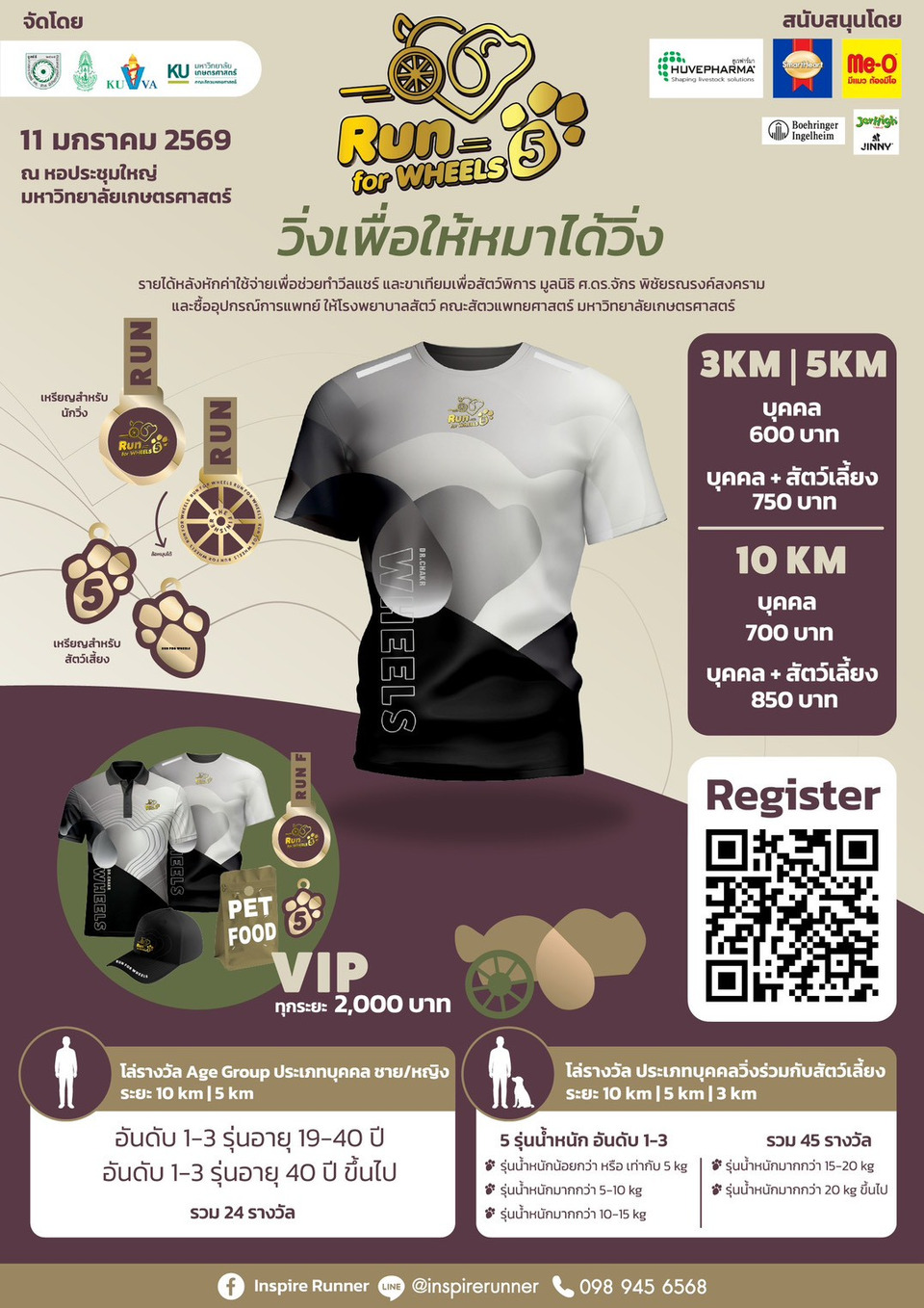 มูลนิธิ ศาสตราจารย์ ดร.จักร พิชัยรณรงค์สงคราม ร่วมกับ มหาวิทยาลัยเกษตรศาสตร์ คณะสัตวแพทยศาสตร์ สมาคมนิสิตเก่าสัตวแพทยศาสตร์ และสมาคมนิสิตเก่ามหาวิทยาลัยเกษตรศาสตร์ ในพระบรมราชูปถัมภ์ ขอเชิญชวนทุกท่านมาร่วมวิ่งไปกับสัตว์เลี้ยงแสนรัก และปันบุญใหญ่ให้กับสัตว์พิการ ได้วิ่งอีกครั้ง ในงาน“Run for Wheels 5 วิ่งเพื่อให้หมาได้วิ่ง ครั้งที่ 5” ชิงถ้วยพระราชทาน พระบาทสมเด็จพระเจ้าอยู่หัว และ สมเด็จพระนางเจ้า ฯ พระบรมราชินี รายได้หลังหักค่าใช้จ่ายสมทบการทำวีลแชร์ และขาเทียมเพื่อสัตว์พิการ มูลนิธิ ศ.ดร.จักร พิชัยรณรงค์สงคราม และซื้ออุปกรณ์การแพทย์ ให้โรงพยาบาลสัตว์ คณะสัตวแพทยศาสตร์ มหาวิทยาลัยเกษตรศาสตร์ กำหนดจัดกิจกรรมขึ้นในวันอาทิตย์ที่ 11 มกราคม 2569 เริ่มกิจกรรมเวลา 04.00 น. ณ หอประชุมใหญ่มหาวิทยาลัยเกษตรศาสตร์ บางเขน
