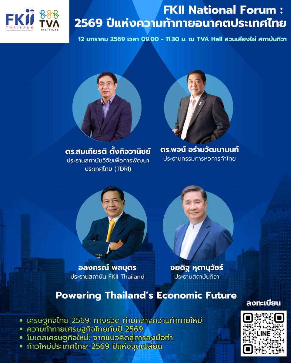 สถาบัน FKII Thailand ร่วมกับ สถาบันทิวา (TVA Institute) ขอเชิญผู้บริหาร นักธุรกิจ นักวิชาการ ภาคนโยบาย และผู้สนใจ เข้าร่วมเสวนา FKII National Forumวันที่ 12 มกราคม เวลา 8.30-11.30 น. ณ TVA Hall สวนเสียงไผ่ สถาบันทิวา ทาวน์อินทาวน์ในหัวข้อ “2569 ปีแห่งความท้าทายอนาคตประเทศไทย“