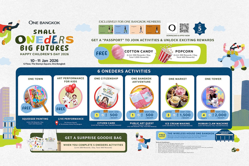 *ร่วมกิจกรรมได้ฟรีโดยไม่มีค่าใช้จ่ายตลอดงาน พิเศษสุดสำหรับ City Makers ตัวน้อยรับฟรี ป๊อปคอร์น (จำกัด 400 สิทธิ์ตลอดรายการ) และ สายไหม (จำกัด 1,000 สิทธิ์ตลอดรายการ) มาร่วมสร้างแรงบันดาลใจและปลดปล่อยจินตนาการที่ไม่รู้จบในงานวันเด็กสุดยิ่งใหญ่ “Small Oneders Big Futures” ในวันเสาร์ที่ 10 และวันอาทิตย์ที่ 11 มกราคม 2569 เวลา 10:00 – 21:00 น. ทั่วทั้งโครงการ วัน แบงค็อก