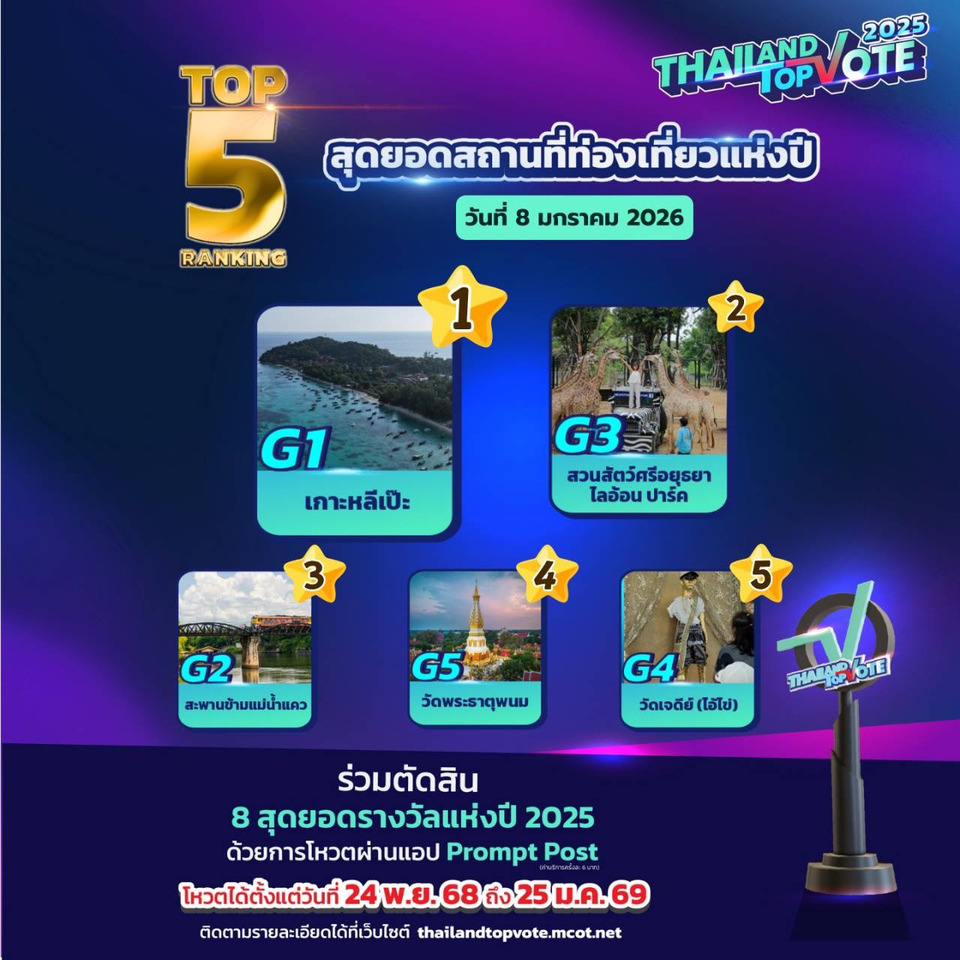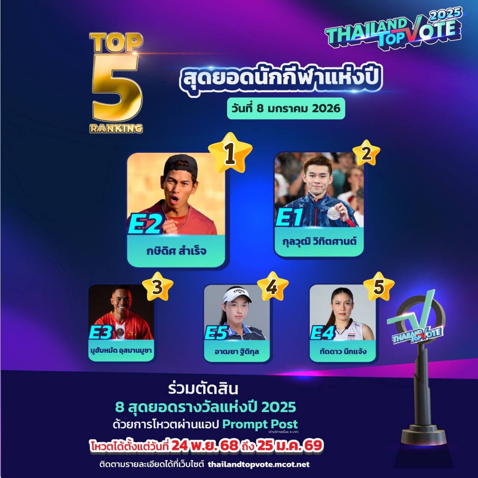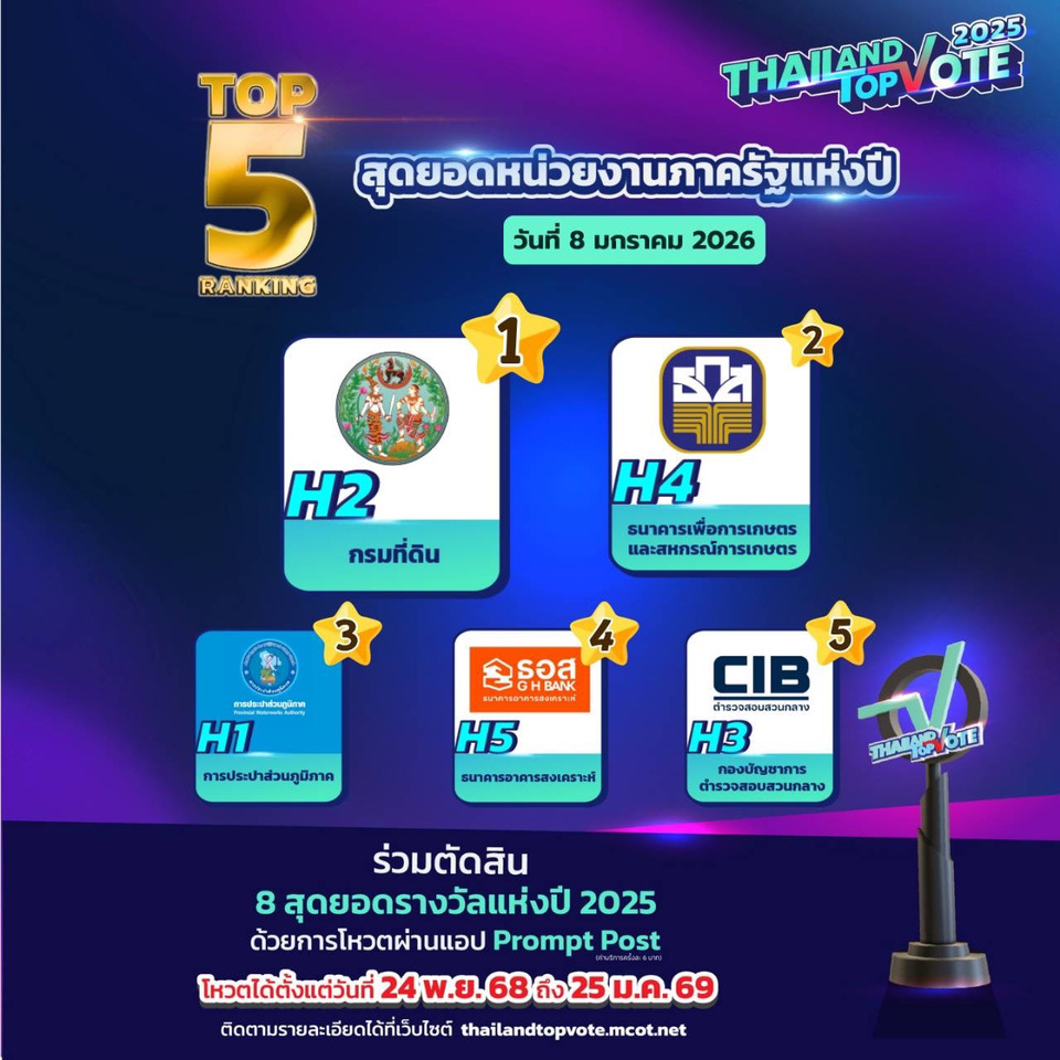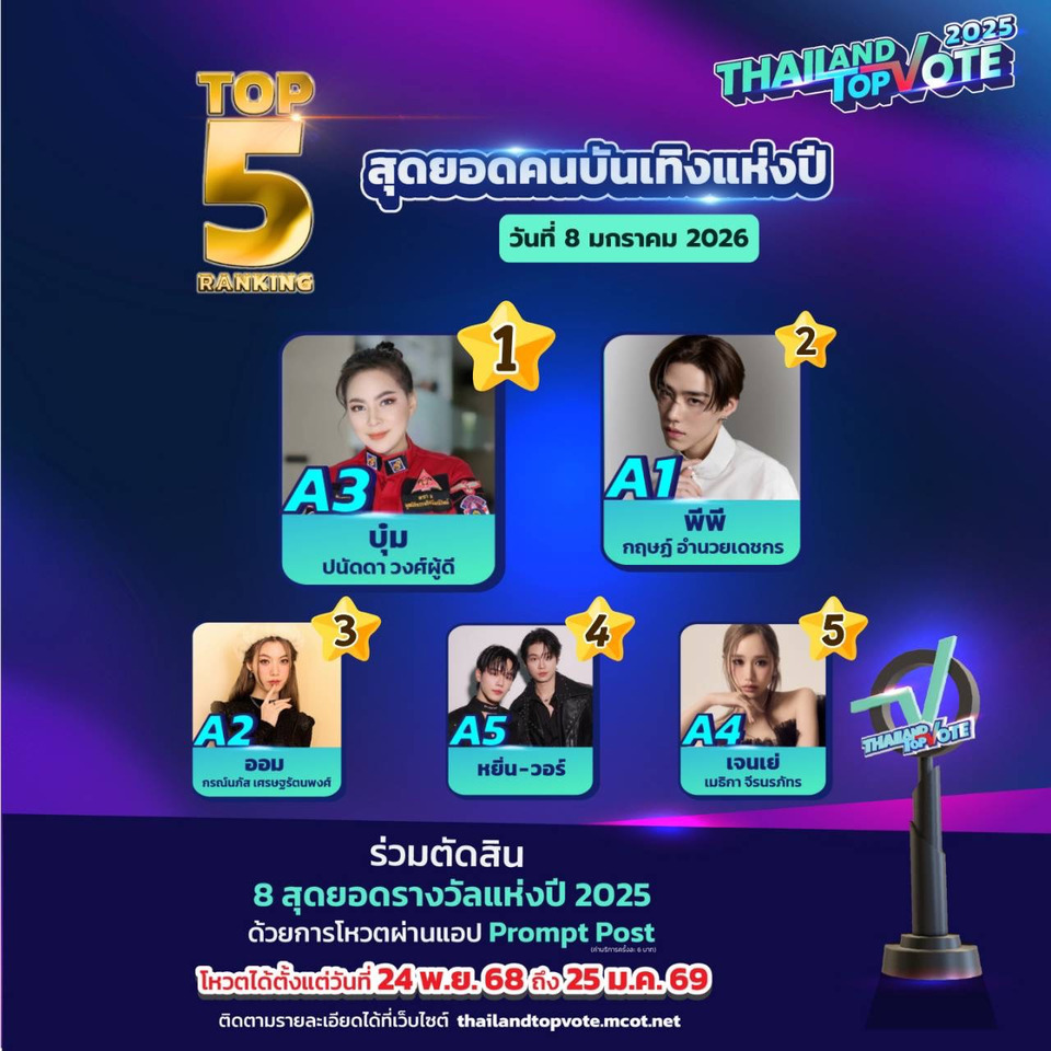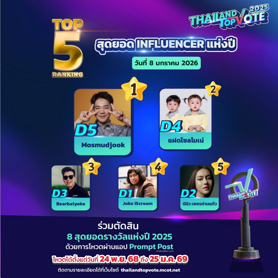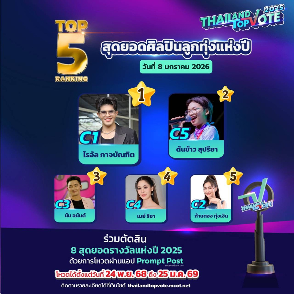 สามารถติดตามกติกาเพิ่มเติมและร่วมเป็นส่วนหนึ่งของรางวัล “Thailand Top Vote 2025” ได้ทาง https://thailandtopvote.mcot.net/