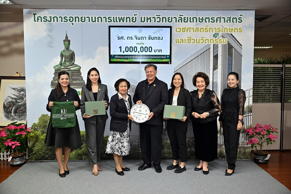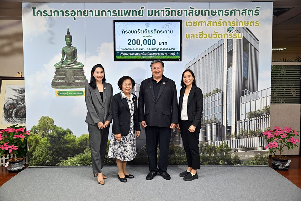 ดร.ดำรงค์ ศรีพระราม รักษาการแทนอธิการบดีมหาวิทยาลัยเกษตรศาสตร์ รับมอบเงินบริจาคเพื่อคณะแพทยศาสตร์และโรงพยาบาลเกษตรศาสตร์ จากรศ.ดร.จินดา ขันทอง อดีตอาจารย์คณะบริหารธุรกิจ มก.จำนวน 1,000,000 บาท และครอบครัวเกียรติกระจาย เพื่ออุทิศให้ ศ.ดร.ปรีชา - รศ.เมธากุล เกียรติกระจาย จำนวน 200,000 บาท โอกาสนี้ ผศ.ดร.นุชนาถ มั่งคั่ง รองอธิการบดีฝ่ายการเงินและกิจกรรมพิเศษร่วมเป็นสักขีพยาน ณ ห้องอธิการบดี อาคารสารนิเทศ 50 ปี มหาวิทยาลัย