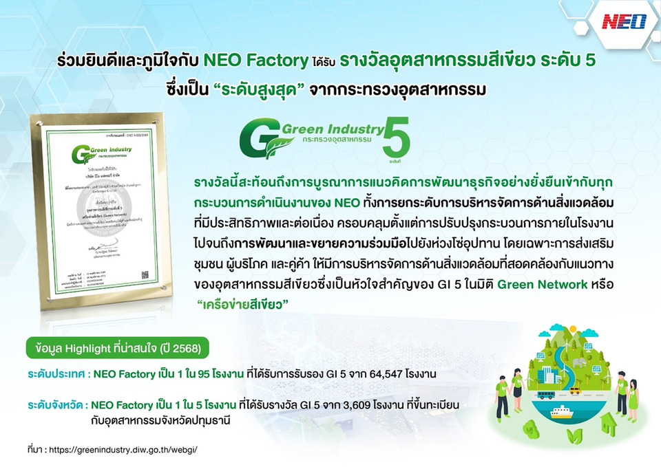 ที่สุดของความภาคภูมิใจ! NEO ได้รับรอง “อุตสาหกรรมสีเขียวระดับที่ 5” ขึ้นแท่นผู้นำ 0.16% จากสถานประกอบการ 6 หมื่นแห่งทั่วประเทศ NEO ตอกย้ำความมุ่งมั่นพัฒนาสู่ความยั่งยืน เดินหน้ายกระดับ Green Network ต่อเนื่องตลอดห่วงโซ่อุปทาน