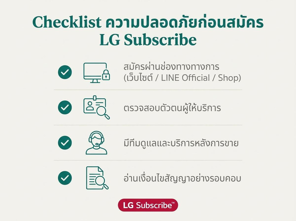 ควรสมัครผ่านตัวแทนขายอย่างเป็นทางการ, เว็บไซต์ LG อย่างเป็นทางการ, LINE Official Account ของ LG หรือ LG Shop ทางการ เพื่อหลีกเลี่ยงความเสี่ยงจากแหล่งที่ไม่น่าเชื่อถือ