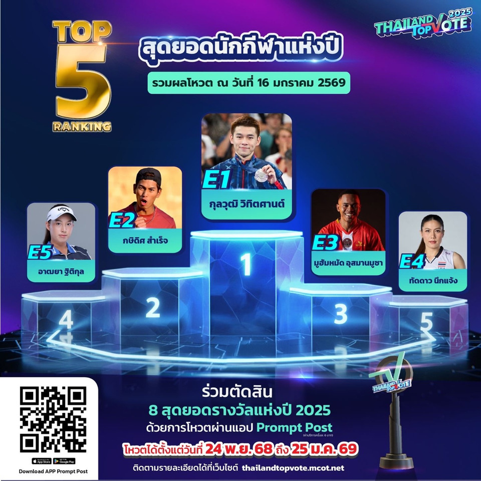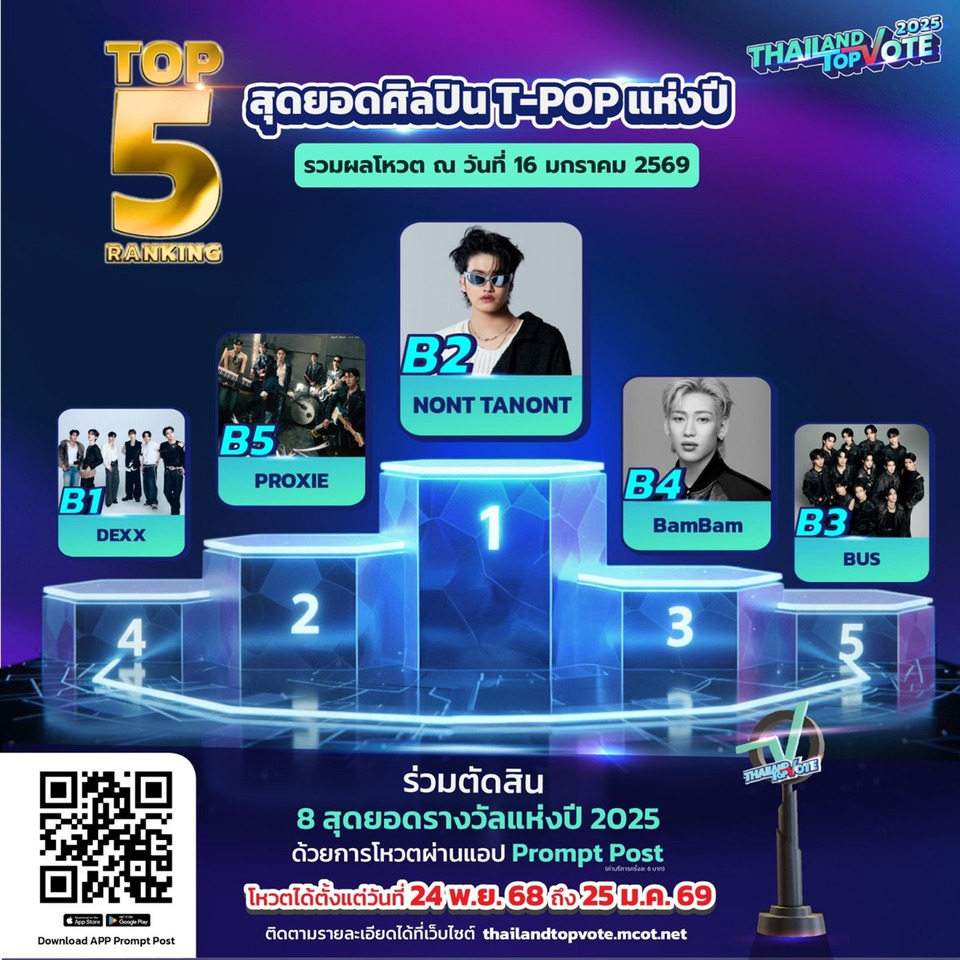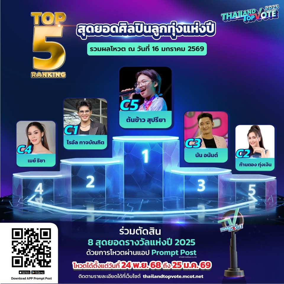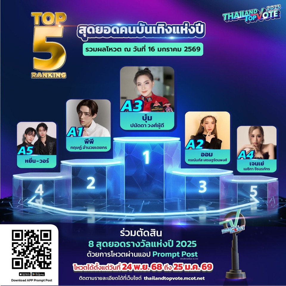 เรียกว่าใกล้โค้งสุดท้าย แต่ก็ยังไม่ท้ายสุด ในการร่วมโหวตรางวัล “Thailand Top Vote 2025” VOICES OF WORTH เสียงแห่งคุณค่า รางวัลที่สร้างความภาคภูมิใจ สร้างแรงบันดาลใจ พร้อมกำลังใจ ให้กับบุคคลและองค์กรในหลากหลายวงการ จากการร่วมมือระหว่าง บริษัท อสมท จำกัด (มหาชน) และ บริษัท ไปรษณีย์ไทย จำกัด กับ 8 รางวัลที่มาจากการโหวตของคนทั้งประเทศ และผู้ที่ก้าวเข้าสู่ TOP 5 ของประเทศ ในแต่ละสาขา โดยล่าสุด RANKING 5 อันดับ ก่อนปิดโหวตในวันอาทิตย์ที่ 25 มกราคมนี้ เรียกว่าผลโหวตเหนี่ยวใจมาก ในแต่ละสาขา