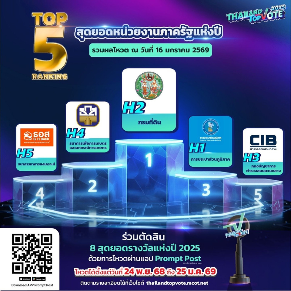 ผลโหวตผู้เข้าชิงสาขารางวัลสุดยอดหน่วยงานภาครัฐแห่งปี อันดับหนึ่ง ณ วันที่ 16 ม.ค. H2 กรมที่ดิน