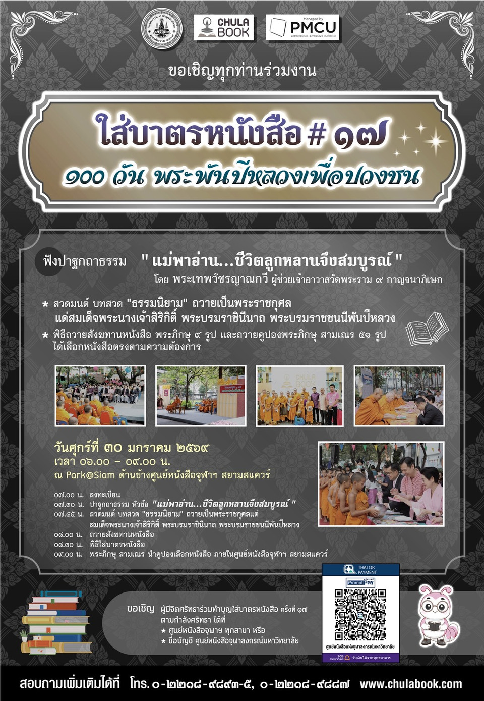 พร้อมฟังปาฐกถาธรรมหัวข้อ “แม่พาอ่าน...ชีวิตลูกหลานจึงสมบูรณ์” โดย พระเทพวัชรญาณกวี ผู้ช่วยเจ้าอาวาสวัดพระราม ๙ กาญจนาภิเษก และร่วมกันสวดมนต์ บทสวด “ธรรมนิยาม” เพื่อถวายเป็นพระราชกุศล แด่สมเด็จพระนางเจ้าสิริกิติ์ พระบรมราชินีนาถ พระบรมราชชนนีพันปีหลวง ในวันศุกร์ที่ 30 มกราคม 2569 เวลา 06.00 – 09.00 น. ณ Park @ Siam ด้านข้าง ศูนย์หนังสือจุฬาฯ สยามสแควร์ ผู้สนใจสอบถามเพิ่มเติมได้ที่ โทร.0-2218-9893-5
