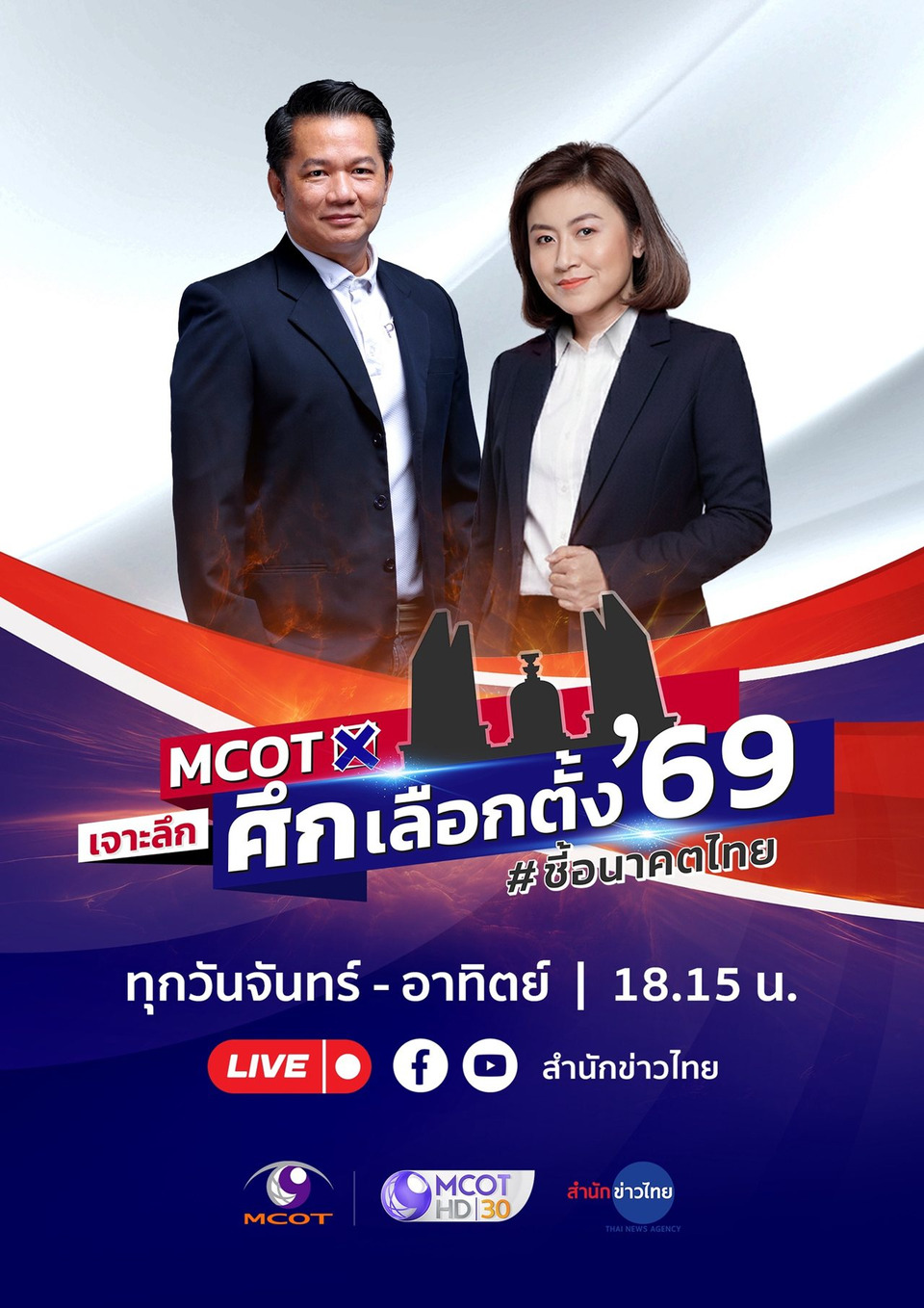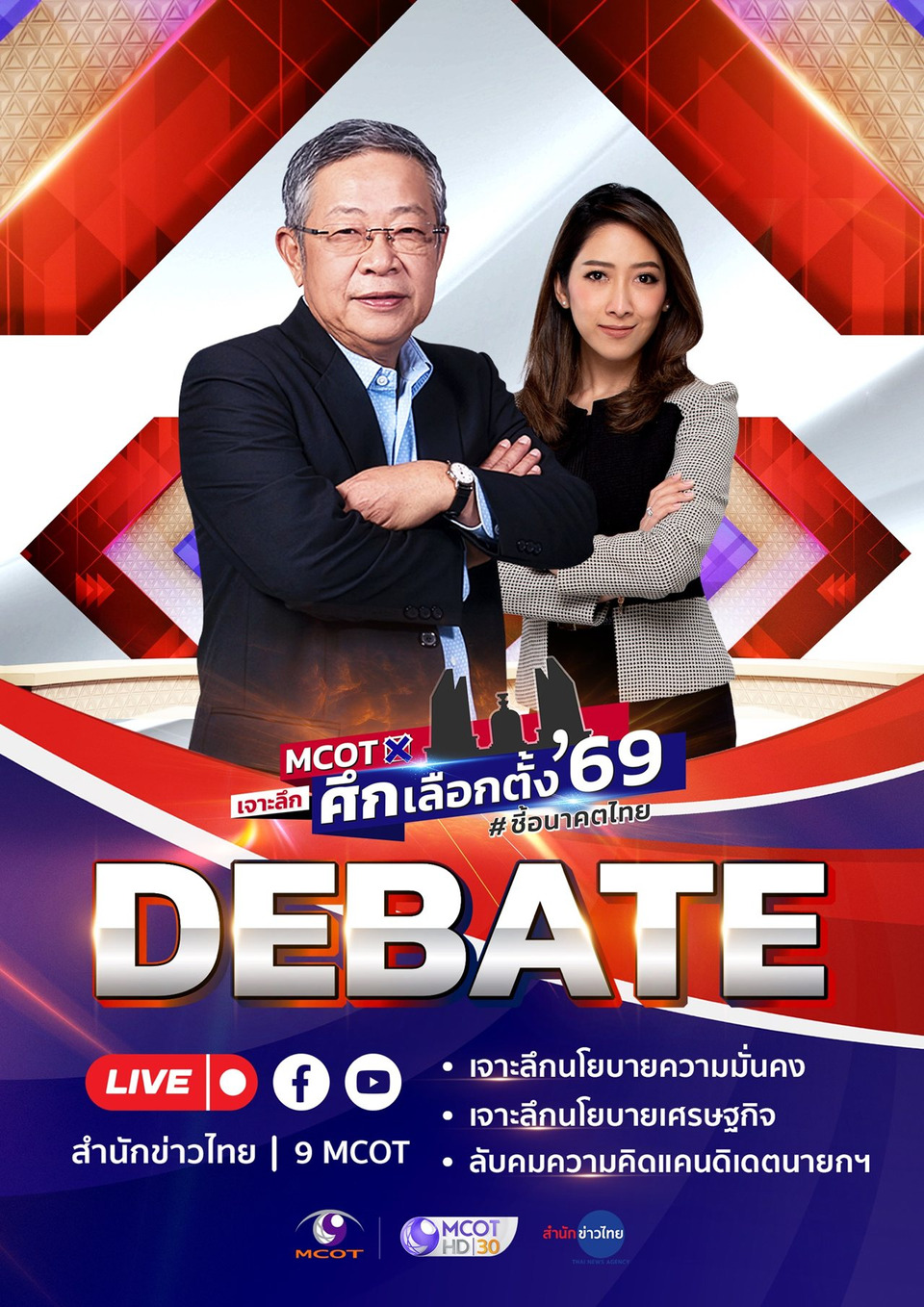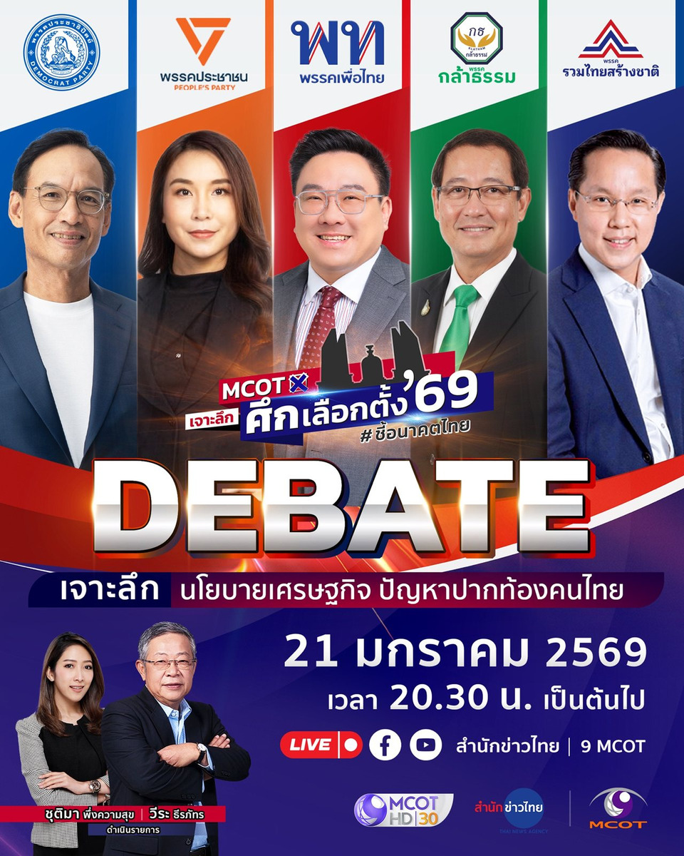 “MCOT เจาะลึกศึกเลือกตั้ง69 #ชี้อนาคตไทย” DEBATE (Live) โดย อาจารย์วีระ ธีรภัทร และ นุ่น ชุติมา พบกับการเจาะลึกนโนบายความมั่นคง นโยบายเศรษฐกิจ พร้อมลับคมความคิดแคนดิเดตนายกฯ ห้ามพลาดในวันพุธที่ 21 มกราคมนี้ เวลา 20.30 น. พบกับ คุณกรณ์ จาติกวณิช แคนดิเดตนายกรัฐมนตรี พรรคประชาธิปัตย์, คุณศิริกัญญา ตันสกุล แคนดิเดตนายกรัฐมนตรี และรองหัวหน้าพรรคประชาชน,คุณจุลพันธ์ อมรวิวัฒน์ แคนดิเดตนายกรัฐมนตรี และหัวหน้าพรรคเพื่อไทย, น.อ. อนุดิษฐ์ นาครทรรพ ประธานยุทธศาสตร์ พรรคกล้าธรรม และ ดร.อรรถวิชช์ สุวรรณภักดี แคนดิเดตนายกรัฐมนตรี รองหัวหน้าพรรคพรรครวมไทยสร้างชาติ มาร่วมพูดคุยเรื่องปัญหาปากท้องของคนไทย และนัดสุดท้ายของการดีเบต วันพุธที่ 4 กุมภาพันธ์นี้ เปิดโฉมหน้าแคนดิเดตนายกรัฐมนตรี ของแต่ละพรรคการเมือง ปักหมุดให้พร้อม ทุกวันจันทร์ถึงวันอาทิตย์ เวลา 18.15 น. พบกับ จิ๊บ-วรรณศิริ และ ณรงค์ จันทร์ทอง ในรายการพิเศษ “MCOT เจาะลึกศึกเลือกตั้ง 69 #ชี้อนาคตไทย” x นับถอยหลัง 30 วัน” (Live) เปิดแนวคิด วิสัยทัศน์ ของนักการเมืองแต่ละพรรค ที่จะหมุนเวียน สลับสับเปลี่ยนมาในแต่ละครั้งก่อนถึงวันเลือกตั้ง โดยอัปเดตแบบเรียลไทม์พร้อมดูย้อนหลังได้ทาง https://www.facebook.com/tnamcot