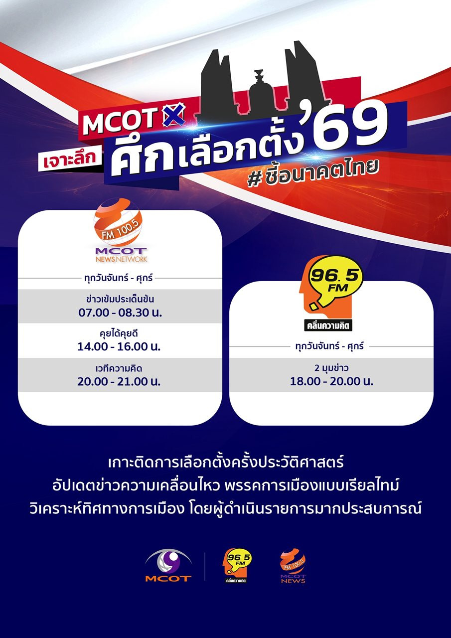 และพบกับ “MCOT เจาะลึกศึกเลือกตั้ง 69 #ชี้อนาคตไทย” โดยวิทยุอสมท ซึ่งมีเครือข่ายทั่วประเทศไทย เริ่มที่คลื่นความคิด ThinkingRadio FM.96.5 https://thinkingradio.mcot.net/thinkingradio/th ทุกวันจันทร์-ศุกร์ เวลา 07.00 น.กับในรายการ “ข่าวเข้มประเด็นข้น” พบกับ อรวรรณ กริ่มวิรัตน์กุล และวิเชษฐ์ พิชัยรัตน์ เวลา 14.00 น. ในรายการ “คุยได้คุยดี” พบกับ อาจารย์วีระ ธีระภัทร, ณัฐพงษ์ ธีระภัทรานนท์ และในเวลา 20.00 น.ในรายการ “เวทีความคิด” พบกับ วิสุทธิ์ คมวัชรพงศ์, รศ.สุขุม นวลสกุล และ ผศ.ดร.ปริญญา เทวานฤมิตรกุล และพลาดไม่ได้กับการอัปเดตข่าวแบบเรียลไทม์ ชัดเจน แม่นยำไปกับ MCOT NEWS FM 100.5 MHz https://news1005.mcot.net/news1005/th ทุกวันจันทร์-วันศุกร์ เวลา 18.00 น. ในรายการ “2 มุมข่าว” พบกับ ไพศาล มังกรไชยา, อัญชลีพร กุสุมภ์ และณรงค์ จันทร์ทอง และในวันอาทิตย์ที่ 8 กุมภาพันธ์นี้ ทั้ง 2 คลื่นปรับผังทั้งหมดเพื่อจัดรายการพิเศษ “เจาะลึกศึกเลือกตั้ง 69” รายงานสดแบบเรียลไทม์ พร้อมเกาะติดบรรยากาศการนับคะแนน ผลสำรวจโพลที่น่าเชื่อถือ และบทวิเคราะห์เจาะลึก การจับขั้วจัดตั้งรัฐบาล ชี้ทิศทางอนาคตประเทศไทย โดยนักวิชาการ ผู้เชี่ยวชาญระดับประเทศ #ช่อง9กด30 #MCOT