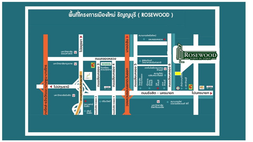 ทำเลศักยภาพสูง ใจกลางแหล่งการศึกษา การพัฒนาเมืองท่องเที่ยว และเมืองราชการ ROSEWOOD TOWN IN TOWN ตั้งอยู่ ตรงข้ามประตู 2 มหาวิทยาลัยเทคโนโลยีราชมงคลธัญบุรี ศูนย์กลางการศึกษาชั้นนำของประเทศรายล้อมด้วยหน่วยงานราชการ แหล่งเรียนรู้ และแลนด์มาร์กระดับประเทศ อาทิ องค์การพิพิธภัณฑ์วิทยาศาสตร์แห่งชาติ และกลุ่มพิพิธภัณฑ์กว่า 9 แห่งบนพื้นที่รวมกว่า 3,000 ไร่ รวมถึงสวนสัตว์ปทุมธานี บนพื้นที่กว่า 300 ไร่ ซึ่งช่วยเสริมศักยภาพด้านเศรษฐกิจ คุณภาพชีวิต และมูลค่าการลงทุนในอนาคต