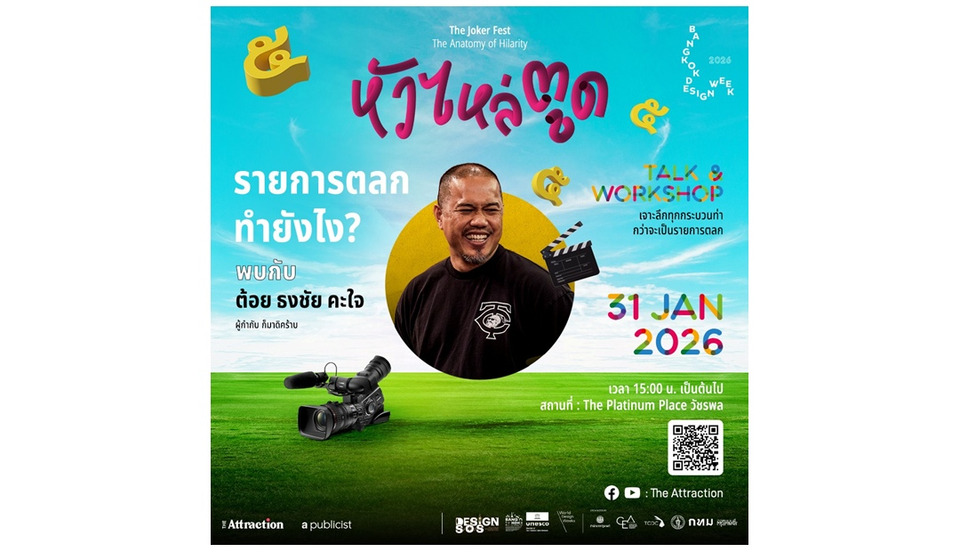 The Attraction ผู้ผลิตสื่อสร้างสรรค์ด้าน Soft Power จับมือกับ สำนักงานส่งเสริมเศรษฐกิจสร้างสรรค์ (CEA) ร่วมปักหมุดแลนด์มาร์คความสุขแห่งใหม่ ใน “เทศกาลงานออกแบบกรุงเทพฯ 2569” หรือ Bangkok Design Week 2026 (BKKDW 2026) ขยายย่านสร้างสรรค์ สู่ “วัชรพล” เป็นครั้งแรก เปิดพื้นที่ใหม่ให้การออกแบบเข้าไปเชื่อมโยงกับชีวิตประจำวันของผู้คน ผ่านโปรแกรมเชิงทดลองสุดล้ำ “หัว ไหล่ ตูด : The Anatomy of Hilarity” กิจกรรมที่จะชวนทุกคนมา "ชำแหละ" เบื้องหลังรอยยิ้ม เรียนรู้กลไกของความตลก และแลกเปลี่ยนมุมมองอย่างมีสาระในบรรยากาศเป็นกันเอง