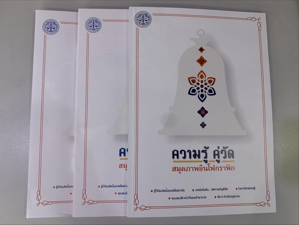 นายยอดฉัตร ตสาริกา ที่ปรึกษาด้านกฎหมาย รักษาราชการแทนผู้อำนวยการสำนักงานกิจการยุติธรรม กล่าวว่า สำนักงานกิจการยุติธรรม ร่วมกับสำนักงานพระพุทธศาสนาแห่งชาติ พัฒนาและเผยแพร่สมุดภาพอินโฟกราฟิกกฎหมาย “ความรู้คู่วัด” สื่อความรู้ด้านกฎหมายที่สอดคล้องกับบริบทของวัดที่สามารถให้ผู้ที่เกี่ยวข้องอย่างพระสงฆ์ ไวยาวัจกร และผู้ปฏิบัติงานในวัด นำไปใช้ในการปฏิบัติหน้าที่ได้จริงเพื่อป้องกันความเสี่ยงในการกระทำผิดกฎหมายในการปฏิบัติหน้าที่โดยไม่ตั้งใจเพราะความไม่รู้กฎหมาย และเสริมสร้างความเชื่อมั่นของประชาชนต่อบุคลากรในพระพุทธศาสนา
