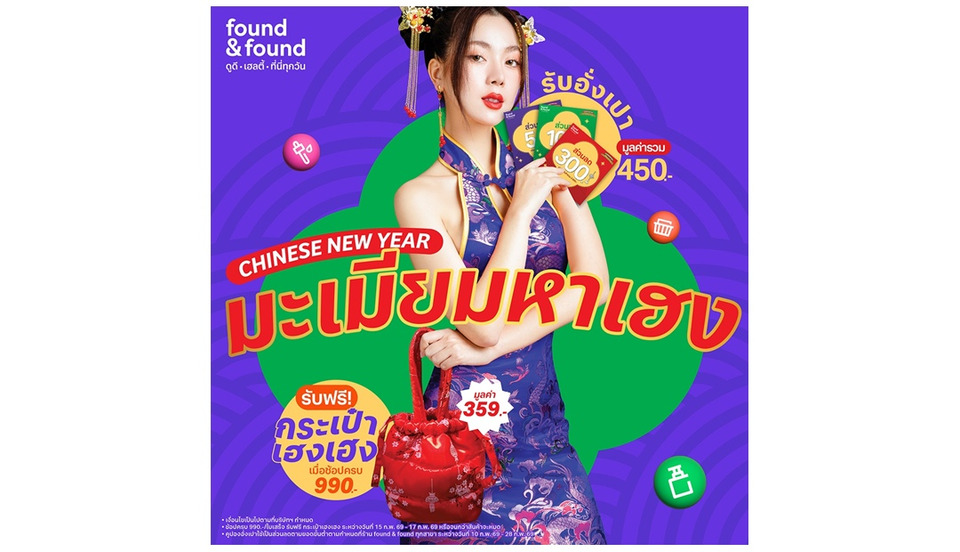 ยังไม่จบแค่นั้น found & found ยังแจกฟรีอั่งเปารับตรุษจีนมูลค่ารวมกว่า 450 บาท ให้สมาชิกทุกคนได้ช้อปเพลิน เริ่ม 10 กุมภาพันธ์ 2569 นี้ แค่นั้นยังไม่พอเมื่อซื้อสินค้าครบ 990 บาท รับ HENG HENG Bag ฟรีทันที ตั้งแต่วันที่ 15-17 กุมภาพันธ์นี้เท่านั้น ติดตามรายละเอียดโปรโมชั่นนี้ได้ผ่านช่องทาง https://www.facebook.com/foundnfound.official