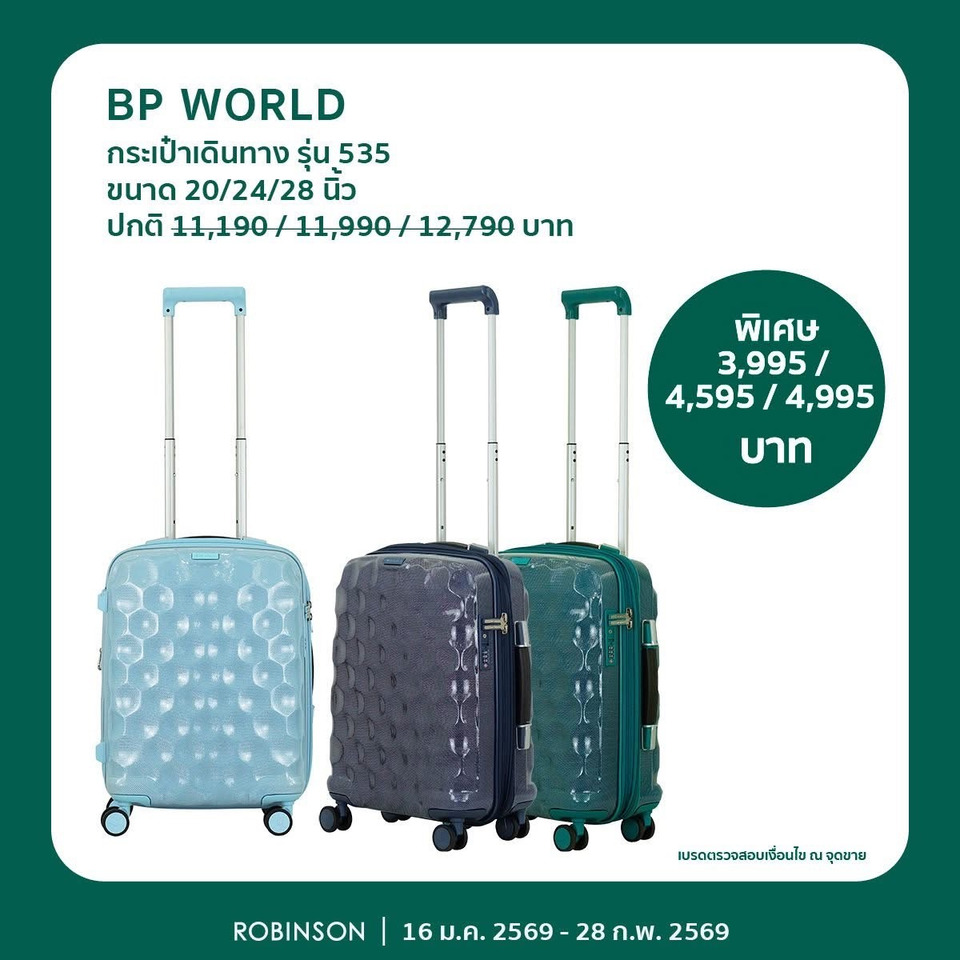 ไอเทมคู่ใจสำหรับสายเที่ยว ที่ช่วยให้ทุกทริป สะดวก คล่องตัว และดูดีตั้งแต่ก้าวแรกที่ออกจากบ้าน คัดมาแล้วว่าใช้งานได้จริงและคุ้มค่า เริ่มต้นด้วย BP World กระเป๋าเดินทาง รุ่น 535 ขนาด 20 / 24 / 28 นิ้ว กระเป๋าเดินทางแบรนด์คุณภาพที่นักเดินทางไว้ใจ โดดเด่นด้วยดีไซน์เรียบหรู แข็งแรง น้ำหนักเบา ล้อหมุนลื่น 360 องศา พร้อมฟังก์ชันจัดเก็บเป็นสัดส่วน ตอบโจทย์ทั้งทริปสั้นและทริปยาว รอบนี้ลดแรงจากราคาหลักหมื่น เริ่มต้นเพียง 3,995 บาท บอกเลยว่าคุ้มเกินราคา ต่อด้วยตัวเลือกสุดคุ้มสำหรับมือใหม่สายเที่ยว Proofs กระเป๋าเดินทาง ABS รุ่น RJP720 ขนาด 20 นิ้ว ไซส์กะทัดรัด เหมาะสำหรับ ทริปสั้นหรือการเดินทางภายในประเทศ วัสดุ ABS แข็งแรง ทนแรงกระแทก ดีไซน์ทันสมัย ใช้งานง่าย ในราคาที่ใครเห็นก็ต้องหยุดมอง เพียง 1,490 บาท เป็นไอเทมเริ่มต้นที่คุ้มค่าและน่าลงทุนมาก