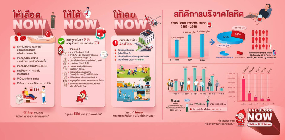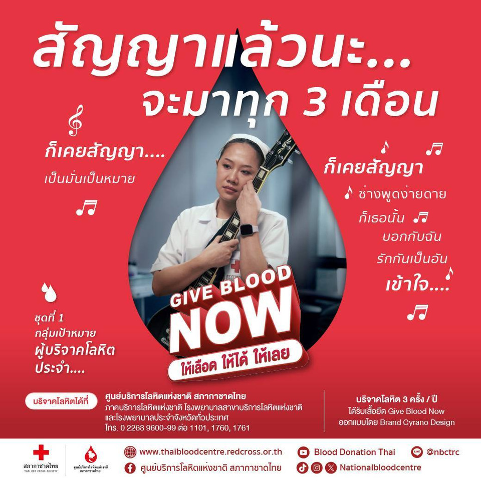 ศูนย์บริการโลหิตแห่งชาติ สภากาชาดไทย ปลุกพลังแห่งการให้ ชวนคนสุขภาพดี บริจาคโลหิตผ่านโครงการ “Give Blood Now - ให้เลือด ให้ได้ ให้เลย” ตลอดปี 2569 เพราะวิกฤติขาดเลือดมีอยู่จริง อย่ารอ หรือลังเลที่จะบริจาคโลหิต สามารถทำได้ทันที ไม่ต้องรอให้มีการร้องขอ พิเศษ! ผู้บริจาคโลหิตครบ 3 ครั้ง และผู้บริจาคโลหิตที่อายุมากกว่า 65 ปี บริจาคโลหิตครบ 2 ครั้งในปี 2569 จะได้รับเสื้อยืด Give Blood Now ลายเส้น Cyrano Design (ไซราโน ดีไซน์) เป็นที่ระลึก