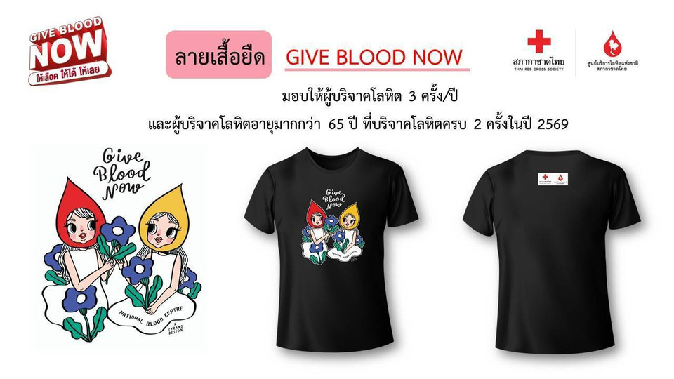 พิเศษ ! สำหรับผู้บริจาคโลหิตครบ 3 ครั้ง และผู้บริจาคโลหิตที่อายุมากกว่า 65 ปี บริจาคโลหิตครบ 2 ครั้ง ในปี 2569 จะได้รับเสื้อยืด Give Blood Now ลายเส้น Cyrano Design (ไซราโน ดีไซน์) เป็นที่ระลึก
