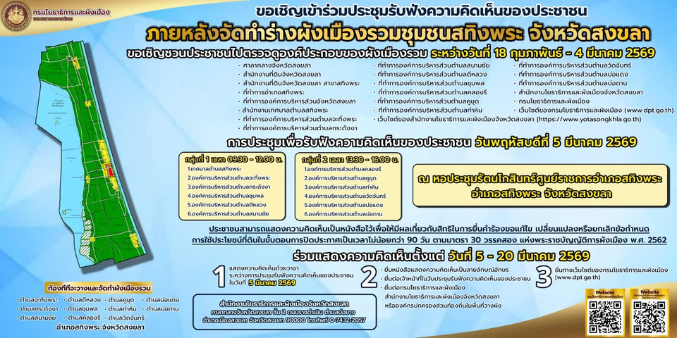 ทั้งนี้ ขอเชิญชวนประชาชนในท้องที่ดังกล่าวเข้าร่วมประชุมแสดงความคิดเห็นและปรึกษาหารือ ในวัน เวลา และสถานที่ ตามที่กำหนดและแสดงความคิดเห็นเป็นหนังสือไว้เพื่อให้มีผลเกี่ยวกับ สิทธิของตนเพื่อเป็นหลักฐานประกอบในการยื่นคำร้องขอแก้ไข เปลี่ยนแปลง หรือยกเลิกข้อกำหนด การใช้ประโยชน์ที่ดินในขั้นตอนการปิดประกาศเป็นเวลาไม่น้อยกว่าเก้าสิบวันตามมาตรา 30 วรรคสอง แห่งพระราชบัญญัติการผังเมือง พ.ศ. 2562 ตั้งแต่วันที่ 5 มีนาคม 2569 จนถึงวันที่ 20 มีนาคม 2569 ซึ่งสามารถขอหนังสือแสดงความคิดเห็นได้ที่กรมโยธาธิการและผังเมือง สำนักงานโยธาธิการ และผังเมืองจังหวัดสงขลา ที่ว่าการอำเภอสทิงพระ สำนักงานเทศบาลตำบลสทิงพระ ที่ทำการองค์การ บริหารส่วนตำบลจะทิ้งพระ ที่ทำการองค์การบริหารส่วนตำบลกระดังงา ที่ทำการองค์การบริหาร ส่วนตำบลสนามชัย ที่ทำการองค์การบริหารส่วนตำบลดีหลวง ที่ทำการองค์การบริหารส่วนตำบลชุมพล ที่ทำการองค์การบริหารส่วนตำบลคลองรี ที่ทำการองค์การบริหารส่วนตำบลคูขุด ที่ทำการองค์การบริหาร ส่วนตำบลท่าหิน ที่ทำการองค์การบริหารส่วนตำบลวัดจันทร์ ที่ทำการองค์การบริหารส่วนตำบลบ่อแดง ที่ทำการองค์การบริหารส่วนตำบลบ่อดาน หรือแสดงความคิดเห็นทางเว็บไซต์ของกรมโยธาธิการและผังเมือง (www.dpt.go.th)