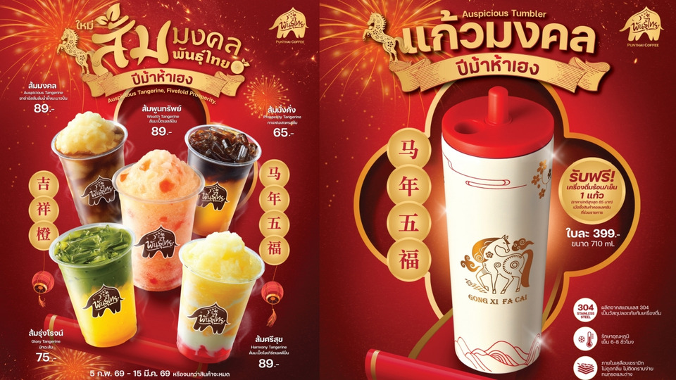 แน่นอนว่า แก้วพรีเมียมคอลเลคชันพิเศษต้องมา พลาดไม่กับ “แก้วมงคล ปีม้าห้าเฮง” แก้วทัมเบลอร์ดีไซน์สวยลายม้าสีทองติดแกลม ขนาด 710 มล. ผลิตจากวัสดุ Food Grade สแตนเลส 304 ภายในเคลือบเซรามิก เก็บอุณหภูมิได้ 6 - 8 ชั่วโมง ในราคาเพียง 399 บาท รับฟรี! เครื่องดื่มร้อนหรือเย็น 1 แก้ว ราคาปกติสูงสุด 65 บาท ตั้งแต่วันที่ 2 ก.พ. 69 – 15 มี.ค. 69 หรือจนกว่าสินค้าจะหมด ที่ร้านกาแฟพันธุ์ไทยทุกสาขาทั่วประเทศ ยกเว้นสาขาสนามบิน