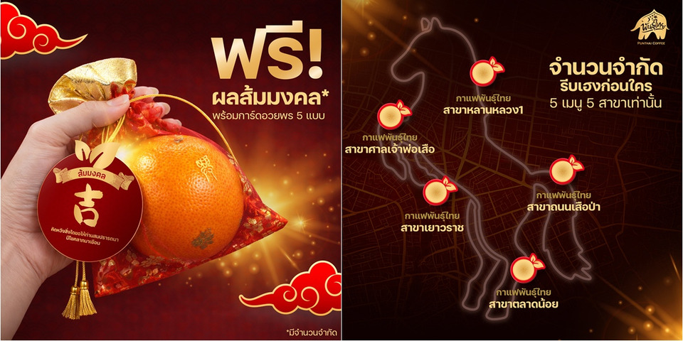 พิเศษสุด! เปิดเส้นทางประตูดวงม้าห้ามงคลรับตรุษจีน รับฟรี! ส้มมงคล 1 ผล พร้อมการ์ดอวยพร เมื่อสั่งเครื่องดื่มส้มมงคลพันธุ์ไทยเมนูใดก็ได้ 1 แก้ว รีบด่วนจำนวนจำกัด ตั้งแต่วันที่ 12 ก.พ. 69 เป็นต้นไป จนกว่าของแถมจะหมด ที่ร้านพันธุ์ไทยทั้ง 5 สาขา