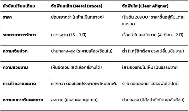 ตารางเทียบชัดๆ จัดฟันใส vs จัดฟันเหล็ก เลือกแบบไหนคุ้มกว่า?