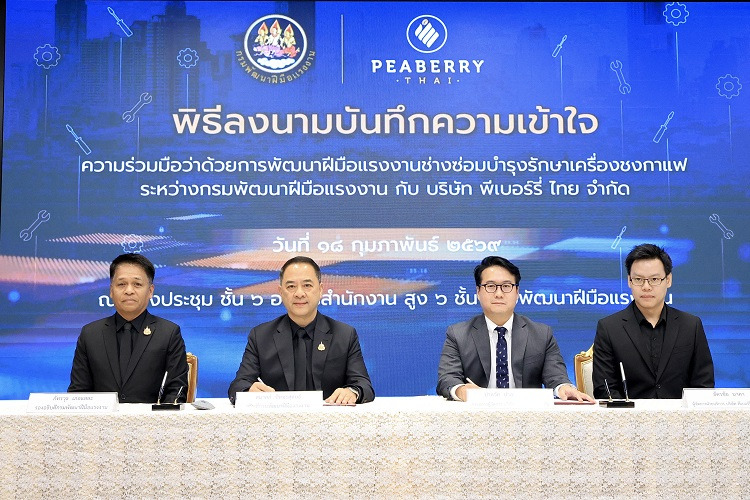 วันที่ 18 กุมภาพันธ์ 2569 นายสมาสภ์ ปัทมะสุคนธ์ อธิบดีกรมพัฒนาฝีมือแรงงาน พร้อมด้วย นายปาลวัศ ปาลวัฒน์วิไชย กรรมการผู้จัดการ บริษัท พีเบอร์รี่ ไทย จำกัด ลงนามบันทึกความเข้าใจความร่วมมือ ระหว่าง กรมพัฒนาฝีมือแรงงาน กับ บริษัท พีเบอร์รี่ ไทย จำกัด เพื่อร่วมกันพัฒนาฝีมือแรงงานสาขาช่างซ่อมบำรุงรักษาเครื่องชงกาแฟ มุ่งยกระดับทักษะกำลังแรงงานไทยให้มีความรู้ ความสามารถ และทักษะฝีมือที่ได้มาตรฐาน สอดคล้องกับการเปลี่ยนแปลงของเทคโนโลยีและความต้องการของตลาดแรงงานในปัจจุบัน โดยมี นายภัทรวุธ เภอแสละ รองอธิบดีกรมพัฒนาฝีมือแรงงาน พร้อม นายอัครชัย นาคา ผู้จัดการฝ่ายบริการ บริษัท พีเบอร์รี่ ไทย จำกัด ร่วมเป็นพยาน ณ ห้องประชุม ชั้น 6 อาคารสำนักงานสูง 6 ชั้น กรมพัฒนาฝีมือแรงงาน