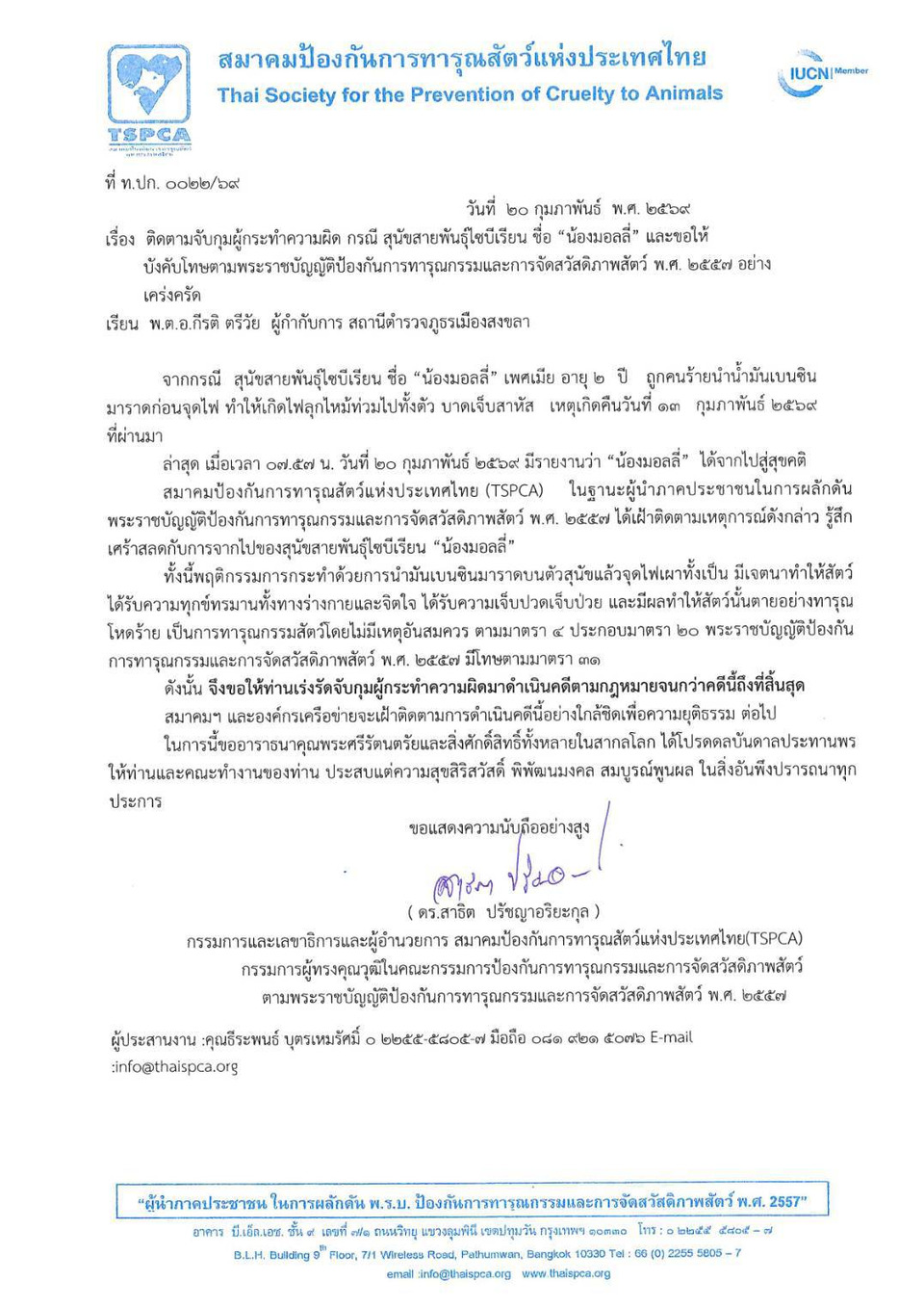 วันที่ 20 กุมภาพันธ์ 2569 จากกรณี สุนัขสายพันธุ์ไซบีเรียน ชื่อ “น้องมอลลี่” เพศเมีย อายุ 2 ปี ถูกคนร้ายนำน้ำมันเบนซินมาราดก่อนจุดไฟ ทำให้เกิดไฟลุกไหม้ท่วมไปทั้งตัวบาดเจ็บสาหัสเหตุเกิดคืนวันที่ 13 กุมภาพันธ์ 2569 ที่ผ่านมา นั้น