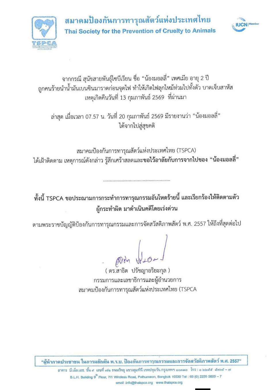 “สมาคมป้องกันการทารุณสัตว์แห่งประเทศไทย (TSPCA) ได้เฝ้าติดตาม เหตุการณ์ดังกล่าว รู้สึกเศร้าสลดและขอไว้อาลัยกับการจากไปของ “น้องมอลลี่” ทั้งนี้ TSPCA ขอประณามการกระทำการทารุณกรรมอันโหดร้ายนี้ และเรียกร้องให้ติดตามตัวผู้กระทำผิด มาดำเนินคดีโดยเร่งด่วน ตามพระราชบัญญัติป้องกันการทารุณกรรมและการจัดสวัสดิภาพสัตว์ พ.ศ. 2557 ให้ถึงที่สุดต่อไป”
