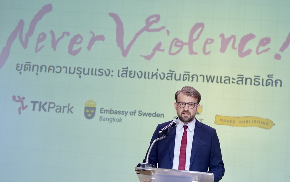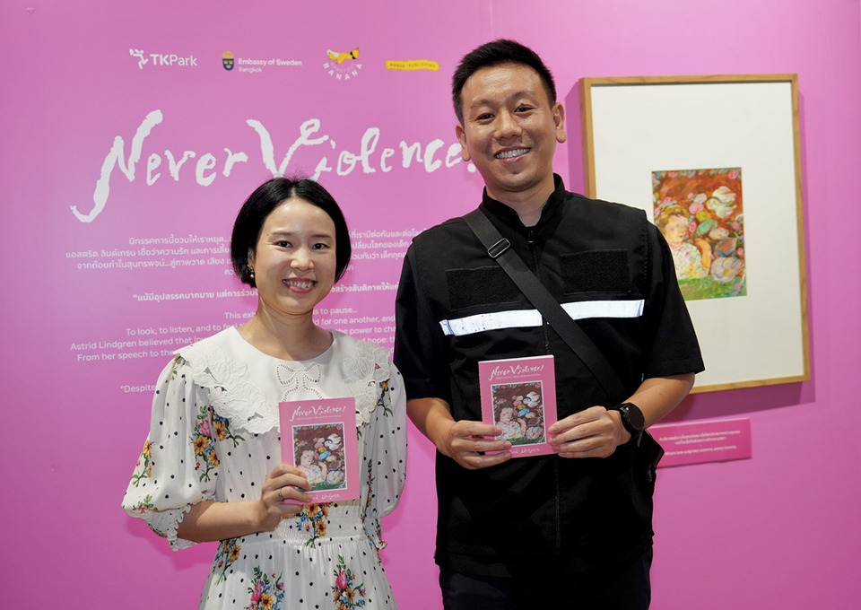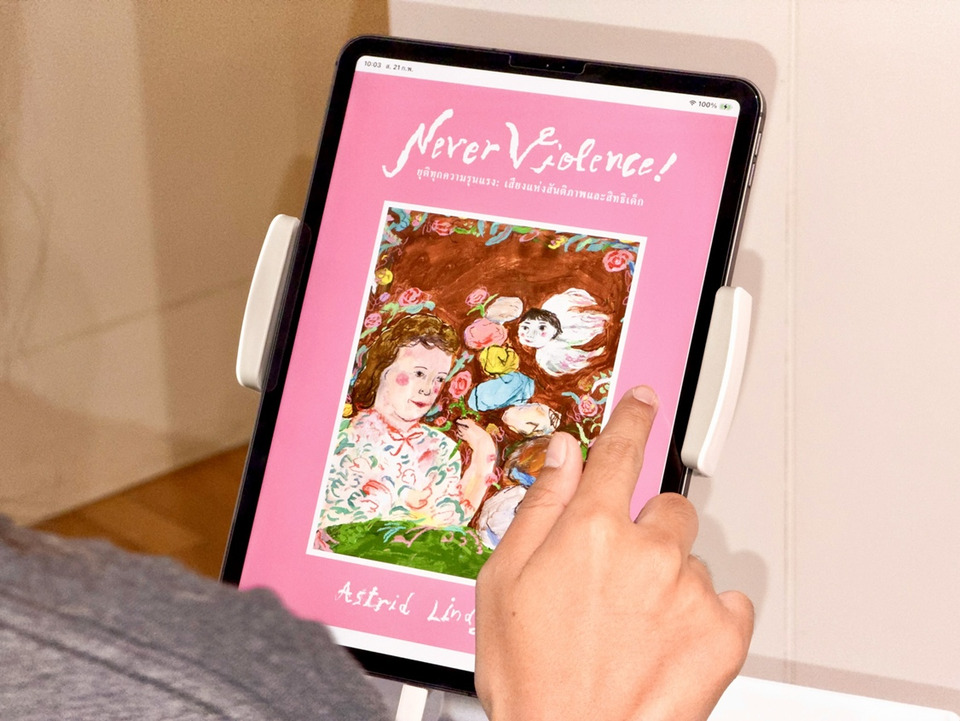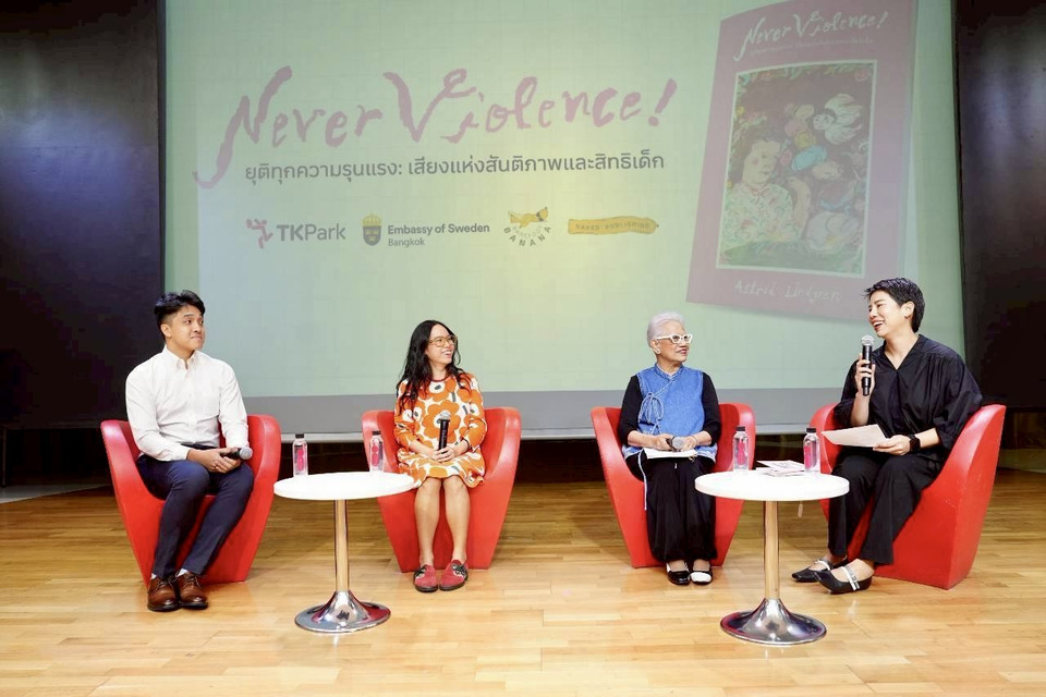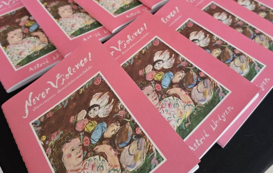 หนังสือ “Never Violence! ยุติทุกความรุนแรง: เสียงแห่งสันติภาพและสิทธิเด็ก” เป็นผลงานของ แอสตริด ลินด์เกรน (Astrid Lindgren) นักเขียนวรรณกรรมเด็กชาวสวีเดน เจ้าของผลงาน “ปิ๊ปปี้ ถุงเท้ายาว” เคยถ่ายทอดผ่านบทกวีและสุนทรพจน์ที่ได้รับการยอมรับในระดับนานาชาติ และมีส่วนผลักดันให้สวีเดนเป็นประเทศแรกของโลกที่ผ่านกฎหมายห้ามลงโทษเด็กทางร่างกายในทุกรูปแบบ ขณะที่ประเทศไทยเพิ่งผ่านกฎหมายนี้ในปีที่ผ่านมา ทำให้การจัดงานครั้งนี้มีความหมายเป็นพิเศษในฐานะ “พื้นที่สาธารณะ” ที่ชวนสังคมกลับมาทบทวนว่า การปกป้องสิทธิเด็กไม่ได้จบที่ตัวบทกฎหมาย แต่เริ่มได้จากการรับฟัง ความเข้าใจ และความสัมพันธ์ที่ไม่ใช้ความรุนแรงในชีวิตประจำวัน