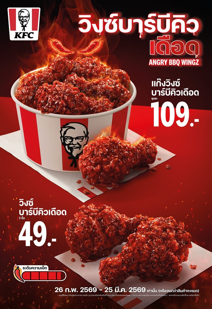 KFC ประเทศไทย กระตุ้นต่อมความเผ็ดของคนไทยเปิดตัวเมนูใหม่ “วิงซ์บาร์บีคิวเดือด” หยิบโมเมนต์สุดคลาสสิกที่คนมักจะเถียงกันบนโต๊ะอาหารเรื่องการรับความเผ็ดได้ช้าเร็วไม่เท่ากัน มาปั้นเป็นความเดือดครั้งใหม่ที่ไม่ได้เผ็ดพุ่งตั้งแต่คำแรก แต่ค่อยๆ ไต่เลเวลแบบสโลว์เบิร์น เล่าประสบการณ์ความเดือดผ่านหนังโฆษณาคอนเซ็ปต์ “ไก่ไม่เผ็ด ก่อนเผ็ดไหม้” ร่วมพิสูจน์ความเดือดให้ไฟลุกไปทั้งโซเชียลในราคาเริ่มต้นเพียง 49 บาท ตั้งแต่วันนี้ – 25 มีนาคม 2569 เท่านั้น