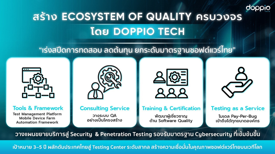- สร้าง Ecosystem ด้าน Software Quality แบบครบวงจร: Doppio Tech มีแผนพัฒนา Ecosystem ครอบคลุมตั้งแต่ต้นน้ำถึงปลายน้ำ ได้แก่