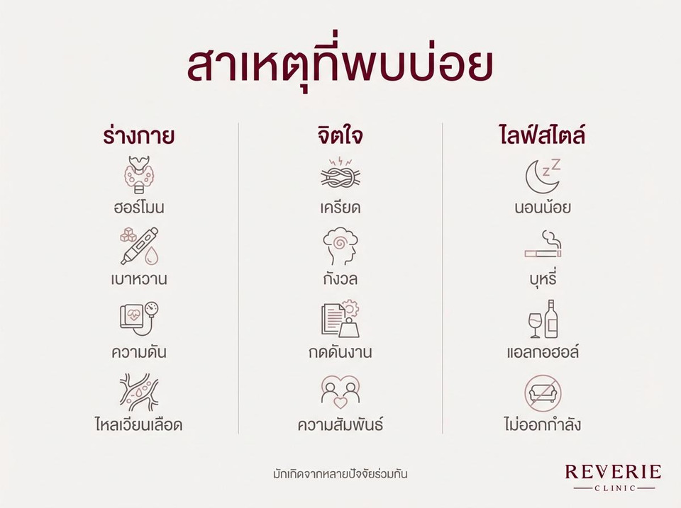 สาเหตุอาจมาจากหลายปัจจัยร่วมกันทั้งความเครียด การพักผ่อนไม่เพียงพอ ระดับฮอร์โมนที่เปลี่ยนแปลง รวมถึงโรคประจำตัวอย่างเบาหวานหรือความดันโลหิตสูง และในบางกรณีอาจเป็นผลข้างเคียงจากยาบางชนิด เช่น ยารักษาความดันโลหิต ยากลุ่มต้านซึมเศร้า หรือยาบางชนิดที่มีผลต่อฮอร์โมน