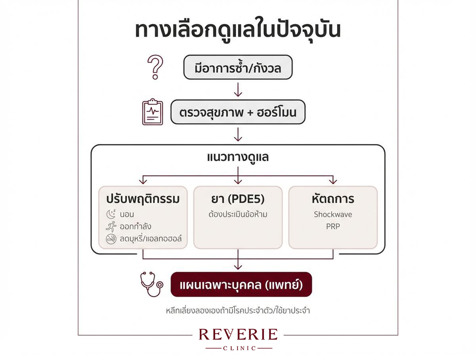 หนึ่งในทางเลือกที่ได้รับความสนใจในปัจจุบัน คือแนวทางการดูแลที่มุ่งเน้นการฟื้นฟูจากต้นเหตุ เช่น PRP ฟื้นฟูสมรรถภาพชาย รวมถึงแนวทางอย่าง Shockwave น้องชาย ซึ่งมักถูกพิจารณาใช้ควบคู่กับการดูแลด้านอื่นอย่างเหมาะสม เพื่อช่วยเสริมประสิทธิภาพในการฟื้นฟูสุขภาพและความมั่นใจในระยะยาว