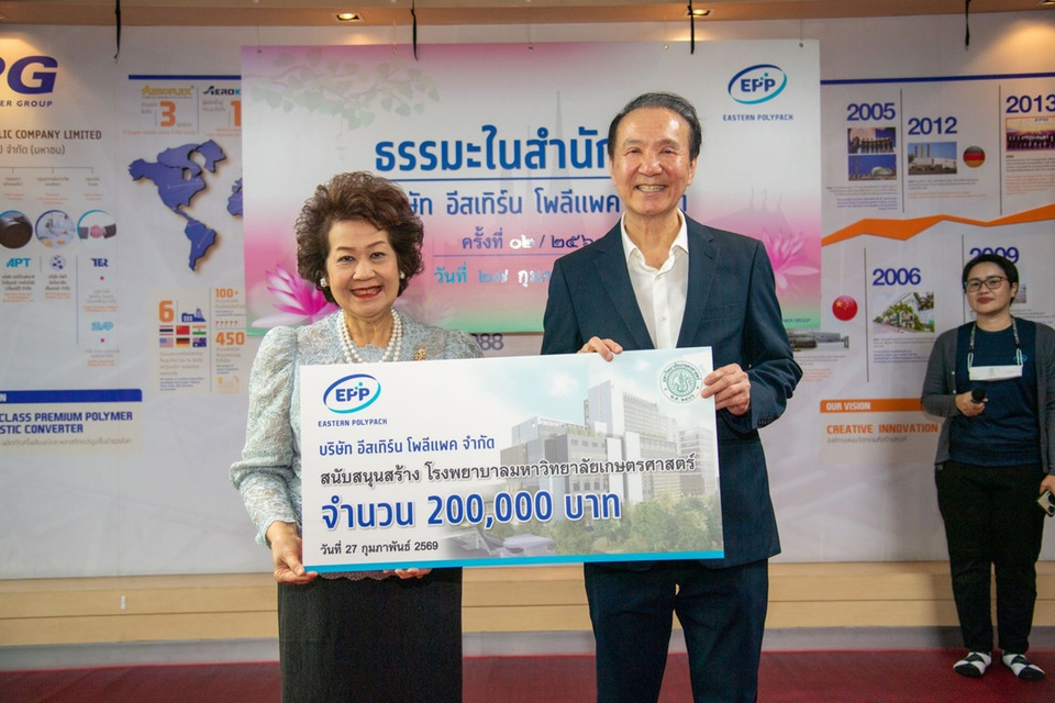 ผศ.ดร.นุชนาถ มั่งคั่ง รองอธิการบดีฝ่ายการเงินและกิจกรรมพิเศษ มหาวิทยาลัยเกษตรศาสตร์ รับมอบเงินบริจาคเพื่อสมทบการสร้างโรงพยาบาลมหาวิทยาลัยเกษตรศาสตร์ โครงการอุทยานการแพทย์มหาวิทยาลัยเกษตรศาสตร์ จำนวน 2,000,000 บาท จากคุณธีระวัฒน์ - คุณสมรวล วิฑูรปกรณ์ และครอบครัว จำนวน 1,800,000 บาท และ บริษัทอีสเทิร์น โพลีแพค จำกัด อีกจำนวน 200,000 บาท ณ บริษัทอีสเทิร์น โพลีแพค จำกัด