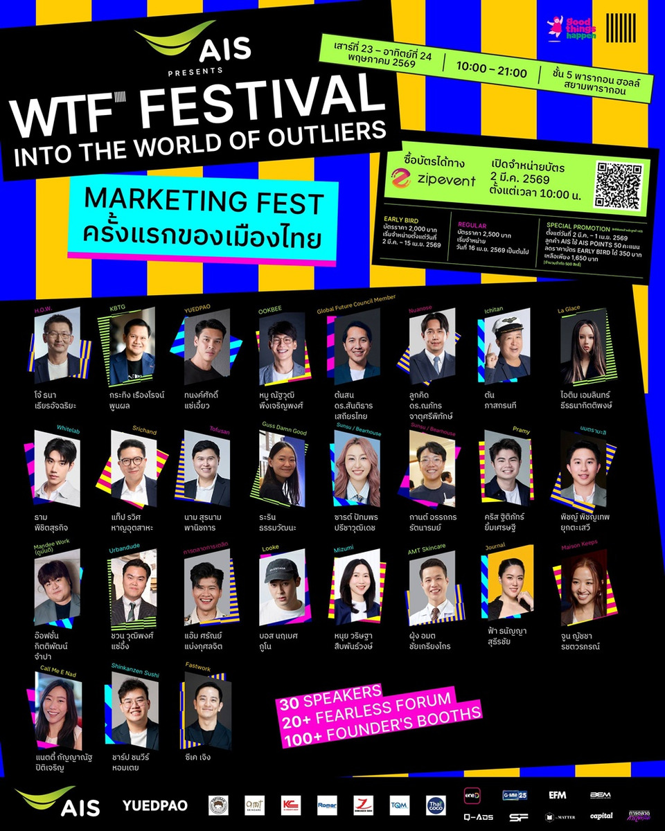 "AIS PRESENTS WTF Festival 2026 : into the world of outliers” เปิดลงทะเบียนจองบัตรเข้างานแล้วที่ ZipEvent https://www.zipeventapp.com/e/WTF-FestivalInto-the-World-of-Outliers บัตรร่วมงาน มีทั้งการเข้าชมฟรี โซน Founder’s Fair และ Fearless Forum และ การจำหน่ายบัตรโซน Outliers Talk บัตร Early Bird ราคา 2,000 บาท (2 มี.ค. – 15 เม.ย. 2569) และ บัตร Regular ราคา 2,500 บาท (ตั้งแต่ 16 เม.ย. 2569 เป็นต้นไป) สิทธิพิเศษสำหรับลูกค้า AIS ใช้ AIS POINTS 50 คะแนน ลดราคาบัตร Early Bird ได้ 350 บาท เหลือเพียง 1650 บาท เริ่มแลกสิทธิ์ 2 มีนาคม 2569 เวลา 10.00 น. – 1 เมษายน 2569 เวลา 23.59 น. จำกัด 500 สิทธิ์แรกเท่านั้น รับสิทธิ์ได้ที่ myAIS หรือ คลิก https://m.ais.co.th/oZHPPEZf4