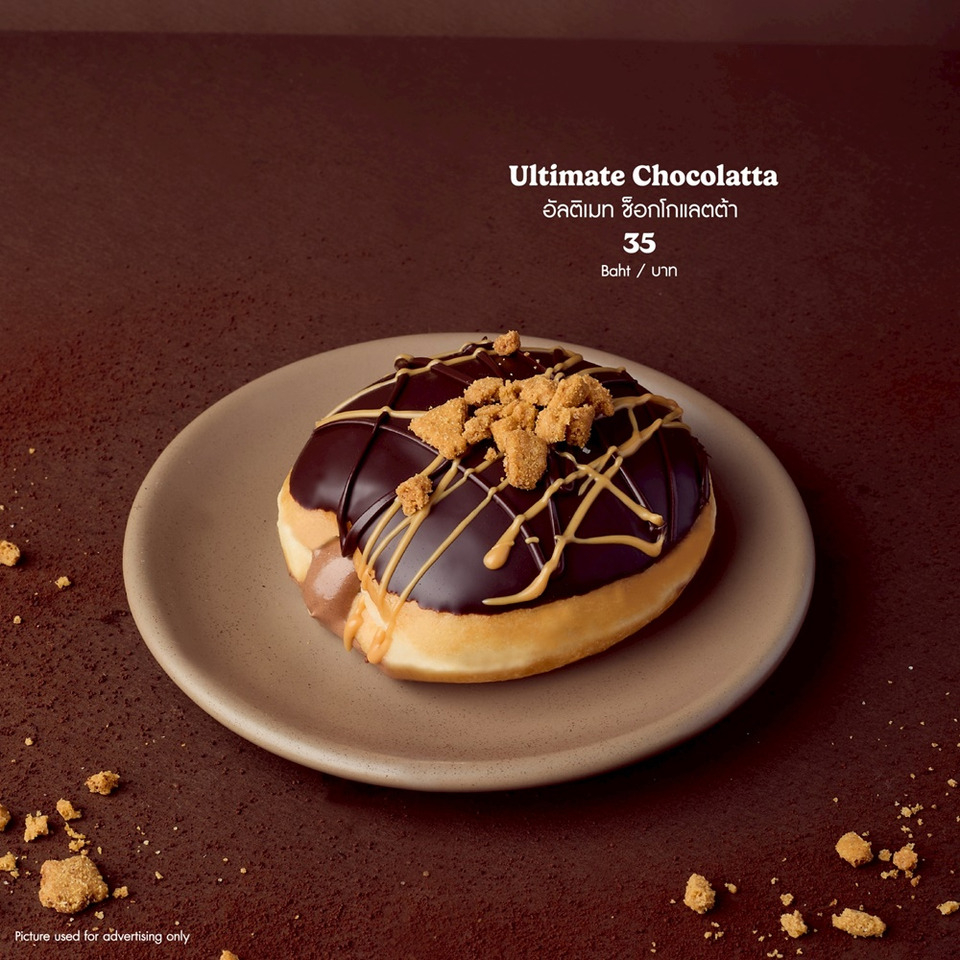“อัลติเมท ช็อกโกแลตต้า” (Ultimate Chocolatta) โดนัทเนื้อนุ่ม สอดไส้ช็อกโกฮาเซลนัทครีม เคลือบดาร์กช็อกโกแลต ท็อปคุกกี้บัตเตอร์ซินนามอน ผสานความเข้มและรสชาติกลมกล่อมไว้ในชิ้นเดียว