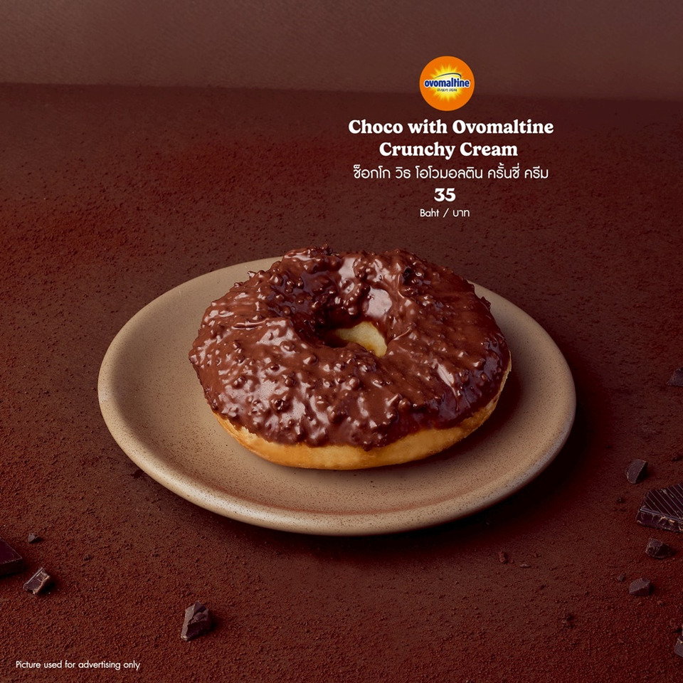 ปิดท้ายกับ “ช็อกโก วิธ โอโวมอลติน ครั้นชี่ ครีม” (Choco with Ovomaltine Crunchy Cream) โดนัทเคลือบโอโวมอลติน ครั้นชี่ โดดเด่นด้วยรสมอลต์เข้มข้น เคี้ยวเพลินในทุกคำ