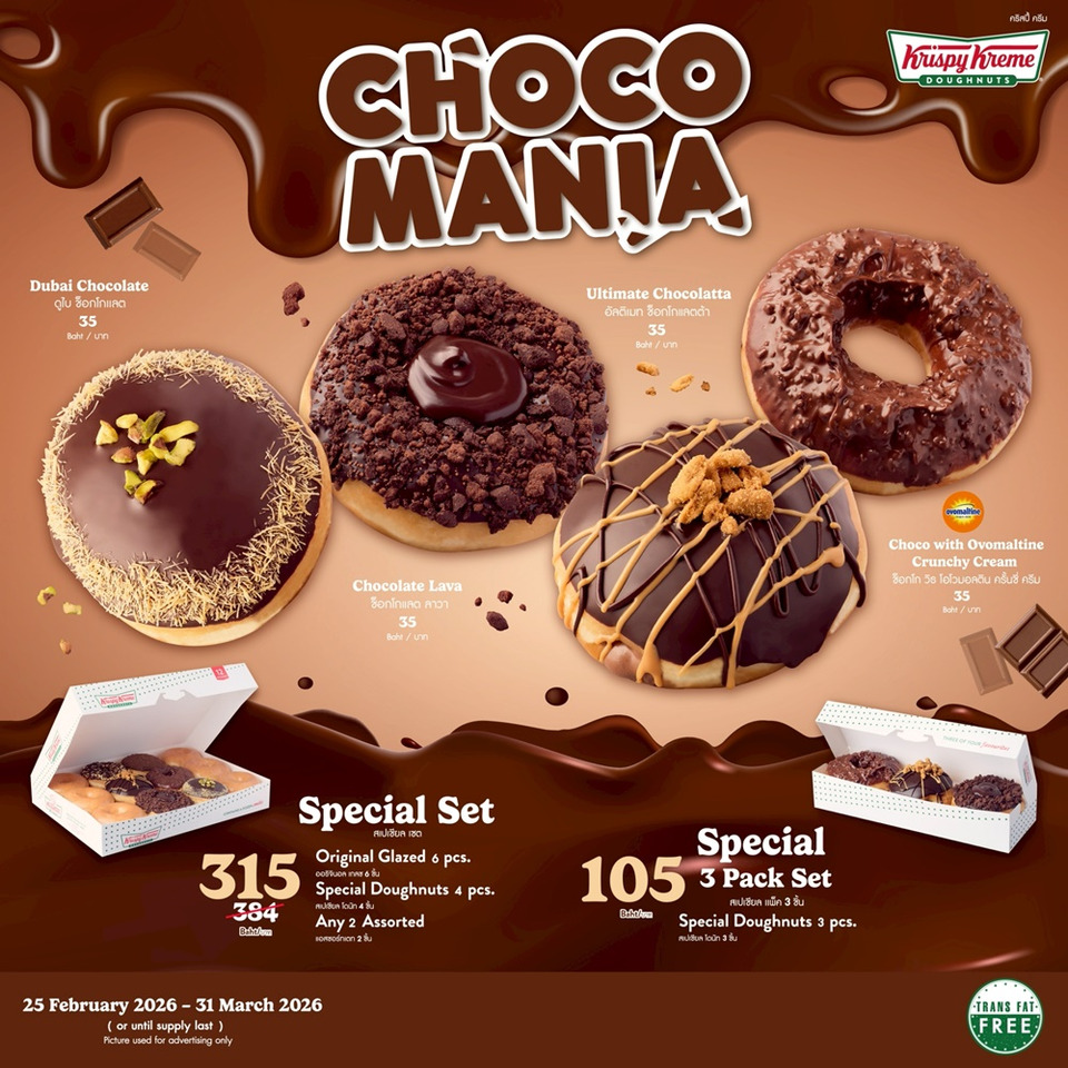 ลิ้มลองความอร่อยเข้มของช็อกโกแลตระดับพรีเมียมกับ “Krispy Kreme CHOCOMANIA Doughnuts” หรือจะเลือกซื้อแบบเซตทั้งแบบแพ็ก 3 (ช็อกโกมาเนีย โดนัท 3 ชิ้น) หรือแบบเซต (ช็อกโกมาเนีย โดนัท 4 ชิ้น, แอสซอร์ทเตท 2 ชิ้น และออริจินอล เกลซ 6 ชิ้น) ตั้งแต่วันนี้ – 31 มี.ค. ที่ ร้านคริสปี้ ครีม ทุกสาขาใกล้บ้านคุณ (ราคาดังกล่าว ยกเว้น สาขาสนามบินสุวรรณภูมิ, สนามบินดอนเมือง และแอปพลิเคชัน ฟู้ดดิลิเวอรี)