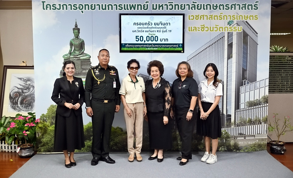 ครอบครัวยมจินดาและนิสิตเก่ามหาวิทยาลัยเกษตรศาสตร์ มอบเงินบริจาค 50,000 บาท สนับสนุนคณะแพทยศาสตร์และโครงการสร้างโรงพยาบาลเกษตรศาสตร์ ขนาด 400 เตียง ภายใต้อุทยานการแพทย์ มุ่งยกระดับระบบสาธารณสุขไทย